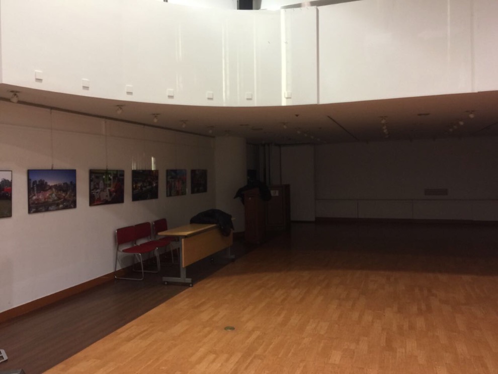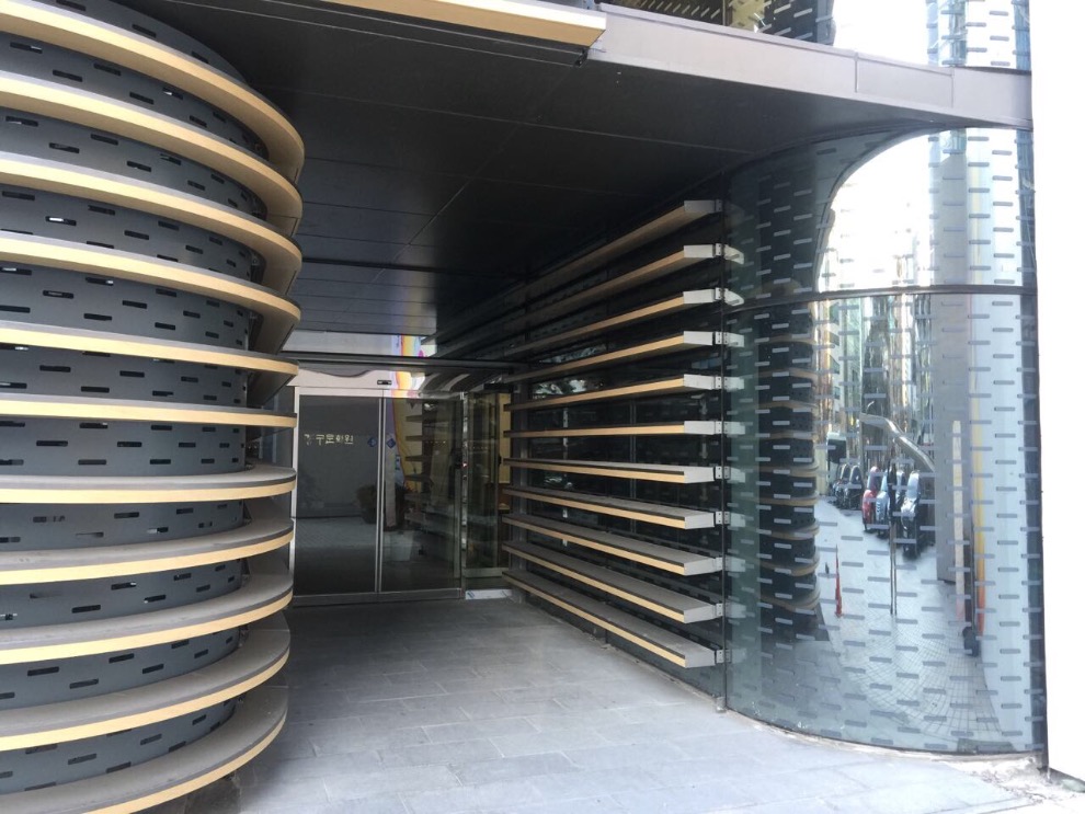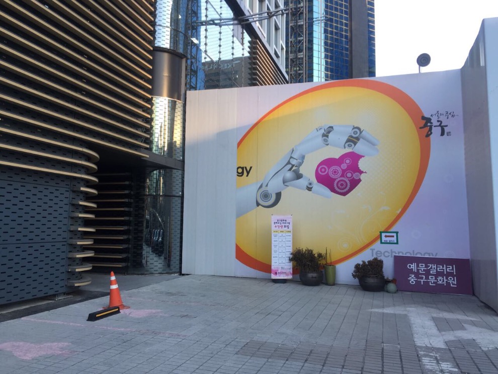 사진 오른쪽 아래 현수막 끝자락쪽 쪽문에 전시장 입구가 있어요.