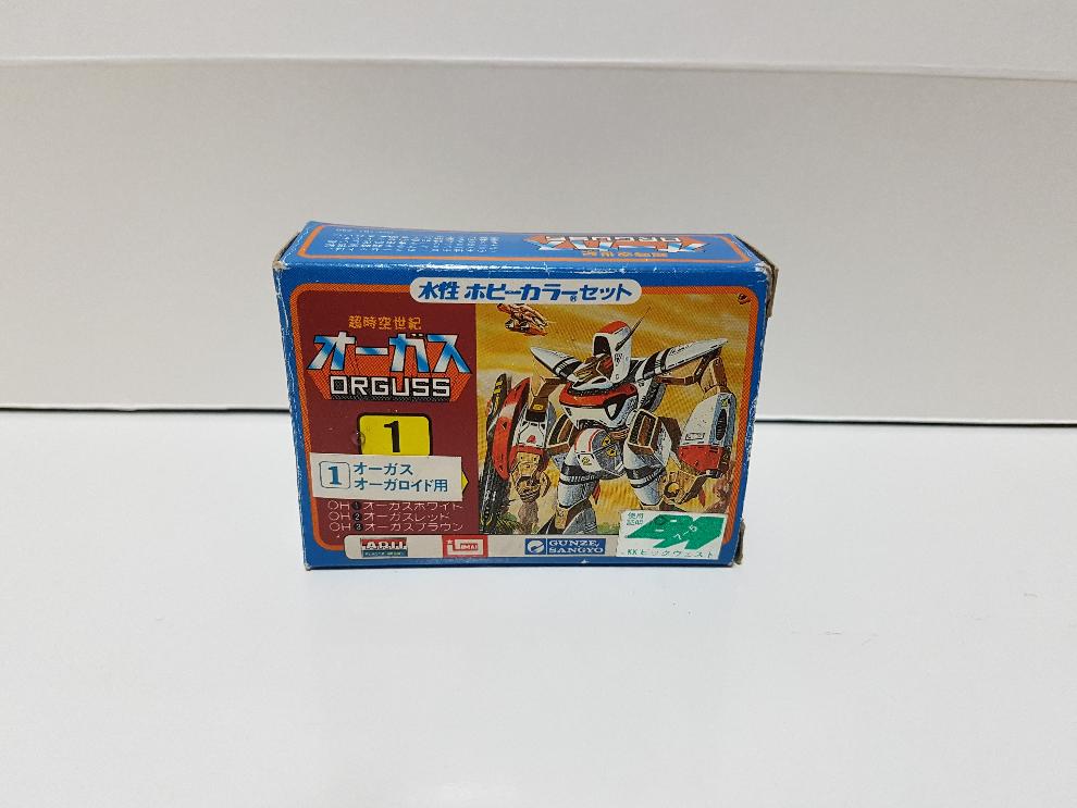 주인공이 타는 흰색 기체 전용 페인트인데, 푸른빛이 도는 흰색, 적색, 갈색, 이렇게 3색을 칠하게 끔 되어 있습니다. 80년대 에어브러쉬가 보편화되기 전인 점에서 대부분 일본 어린이들은 붓도색을 하였을 것 같군요.