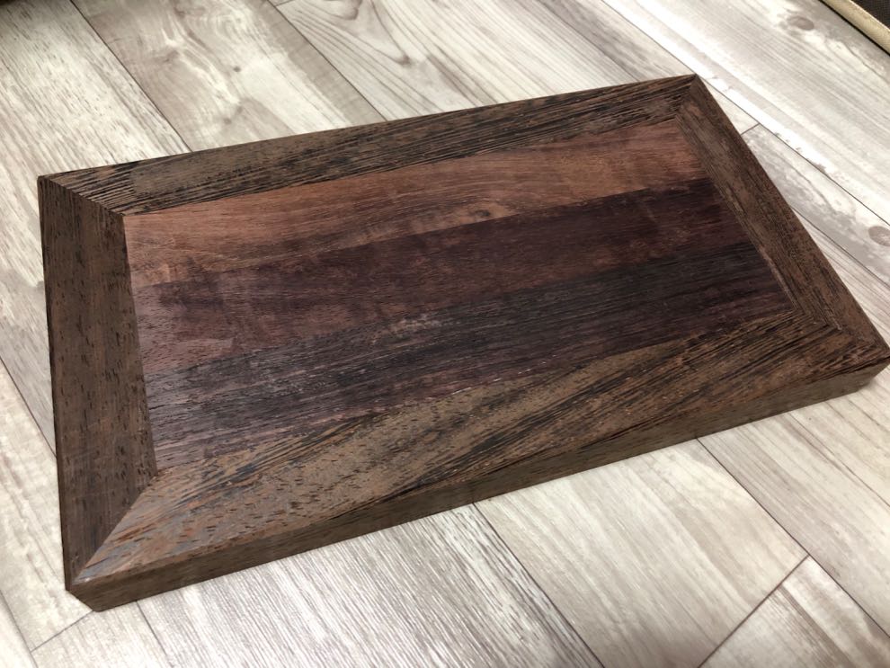 웽게라는 나무입니다. 나무가 무척 무겁고 단단합니다. 대패질도 뭔가 잘 안되는 느낌이고요. 테두리는 웽게, 윗판은 아마 장미목인데 폭이 좁아서 집성해서 만들었습니다. 각도 절단기 하나 있으면 간단하게 끝날 것인데 손으로 하다보니 꽤 시간이 많이 듭니다. 모서리 다듬어주고 표면다듬어준다음 기름으로 마무리할 예정입니다.