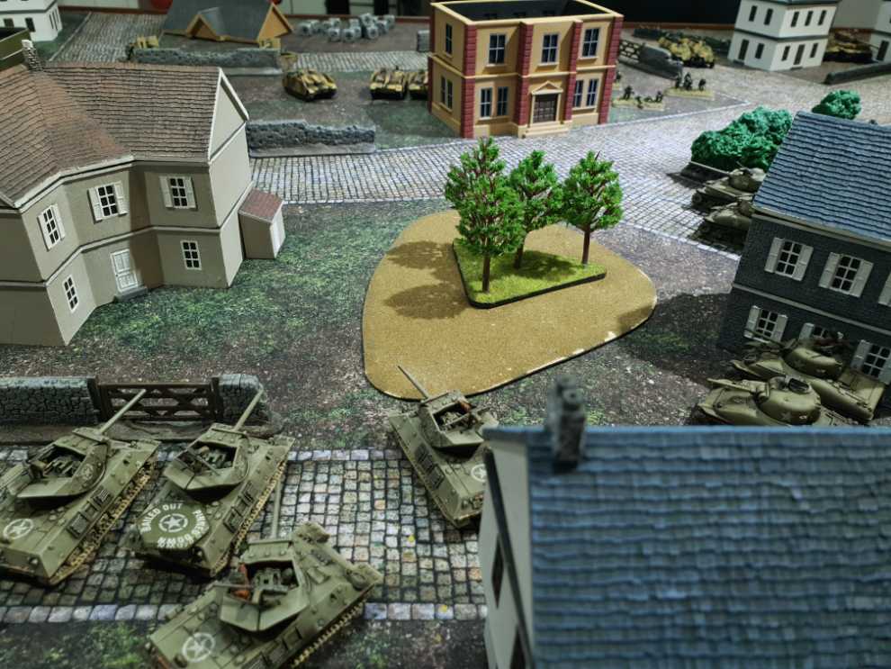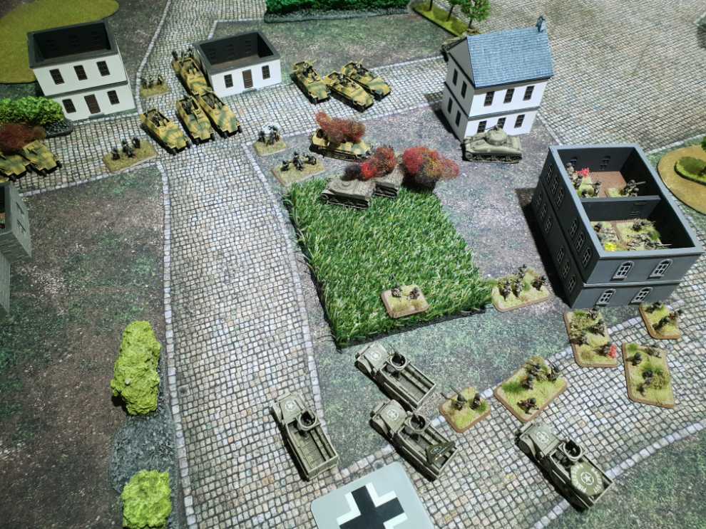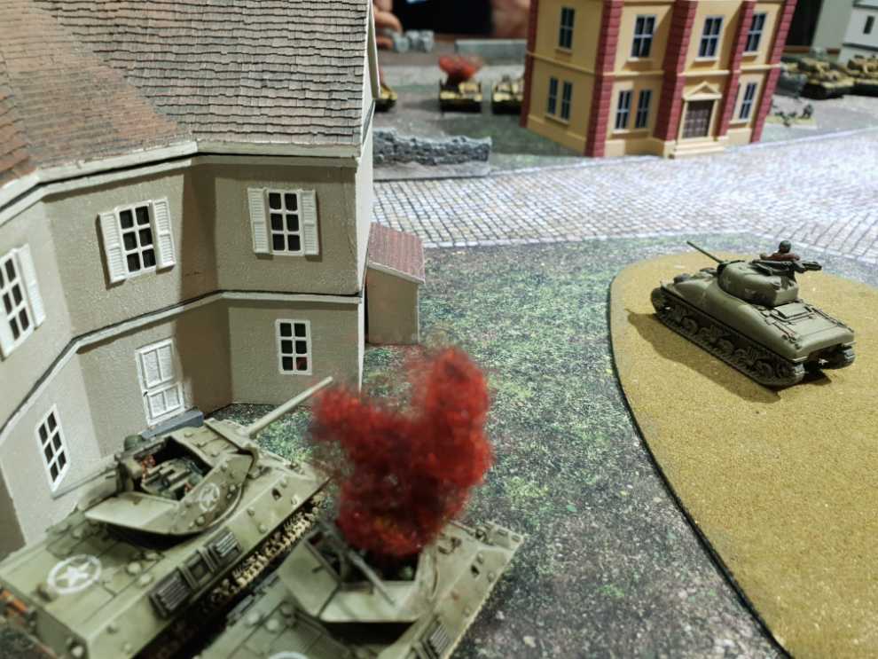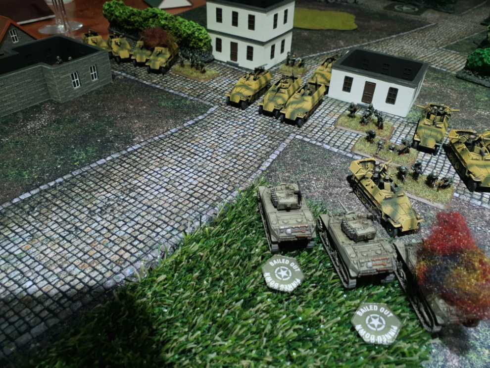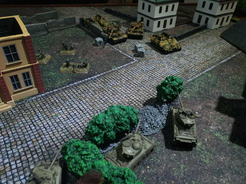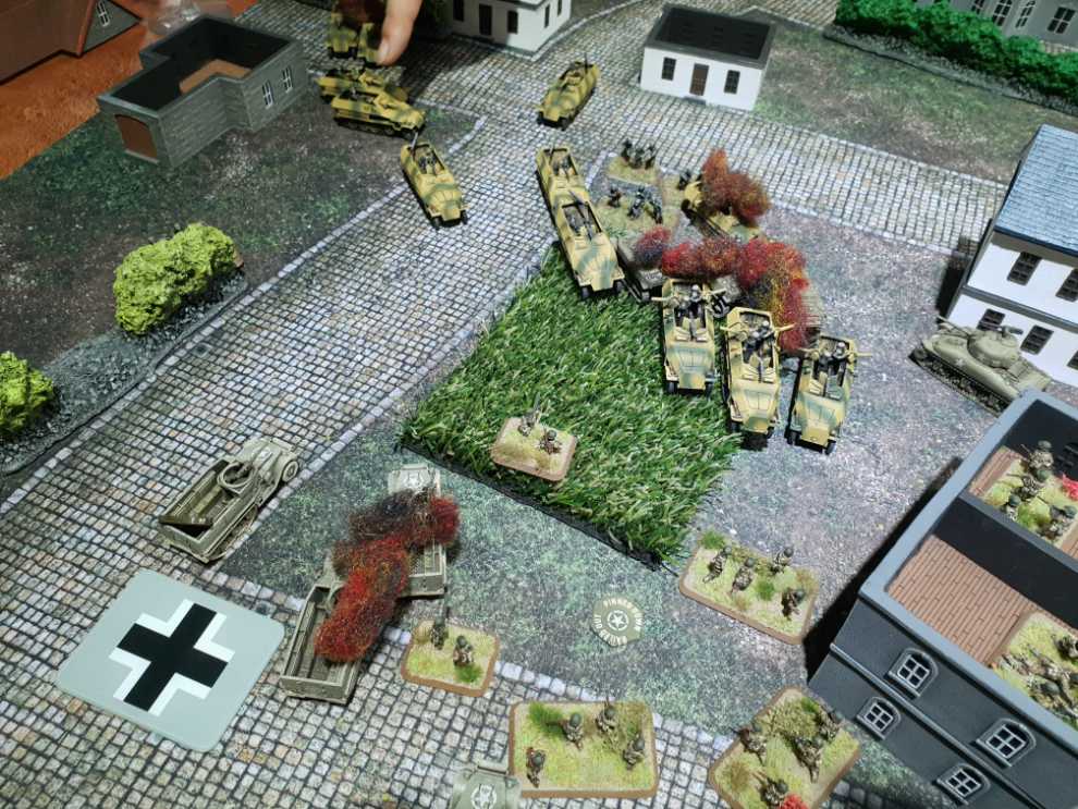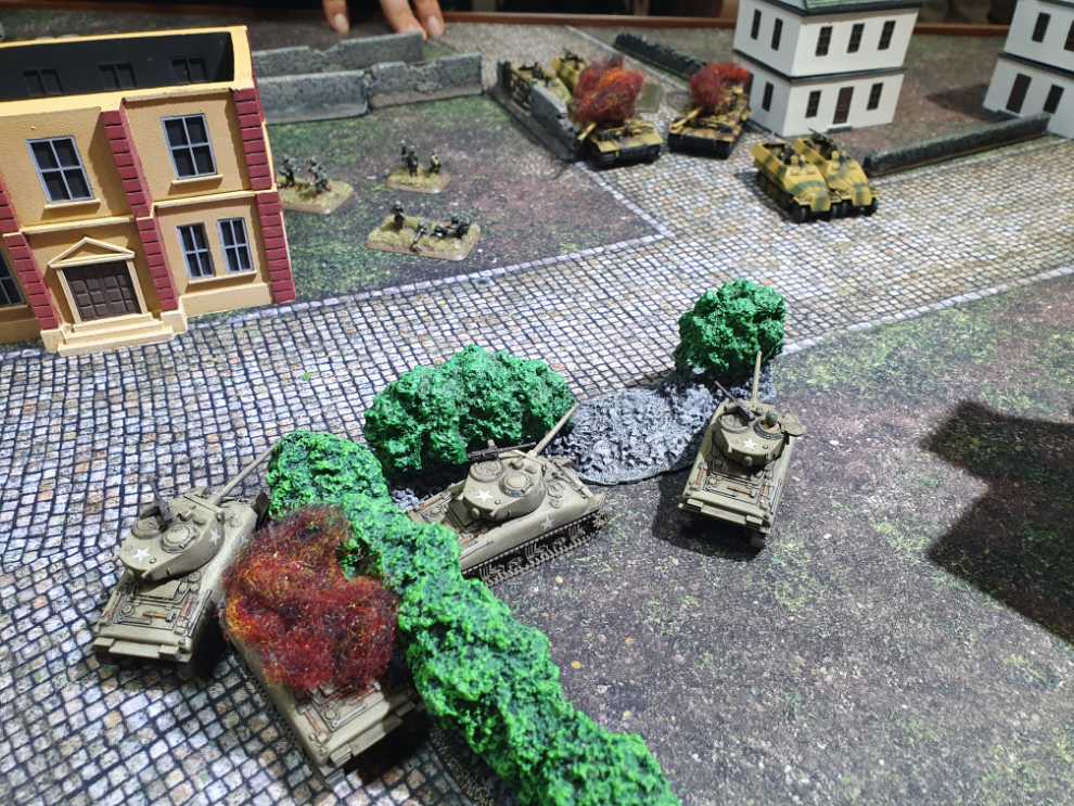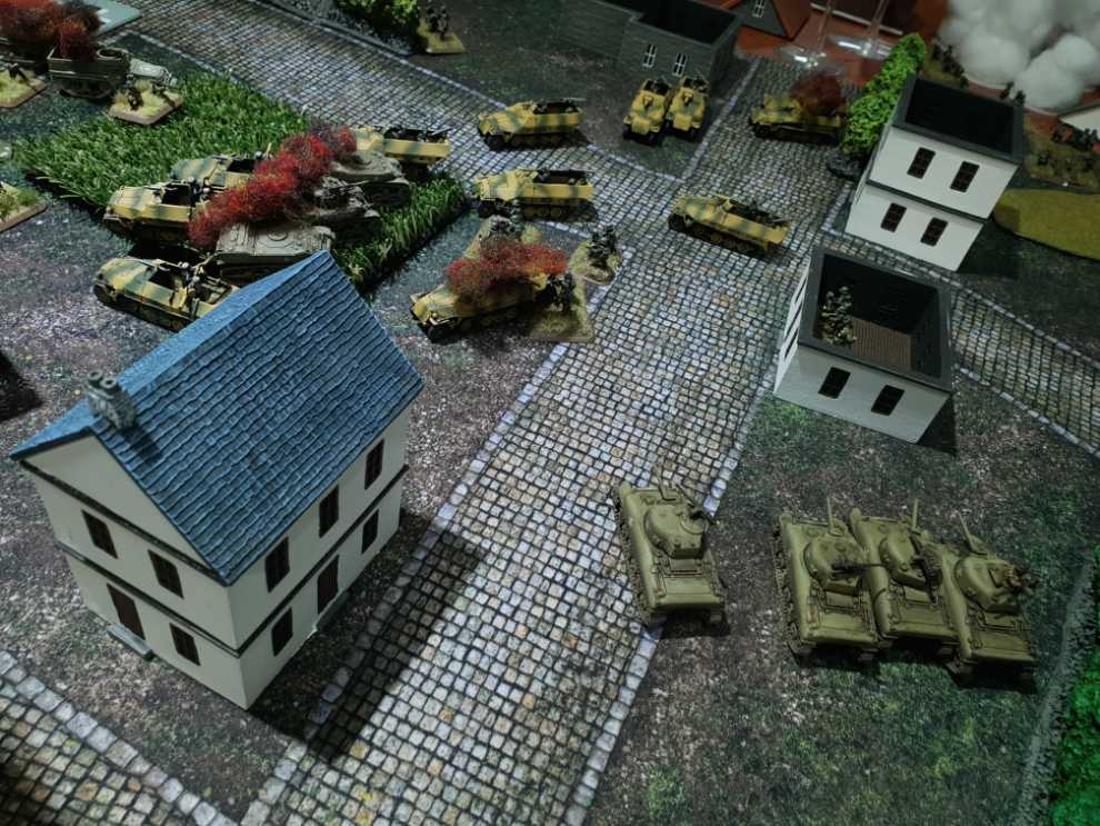 중앙의 전차전은 미군의 승리로 보입니다. STUG 소대가 한 대만을 남겨두고 모두 파괴됩니다.