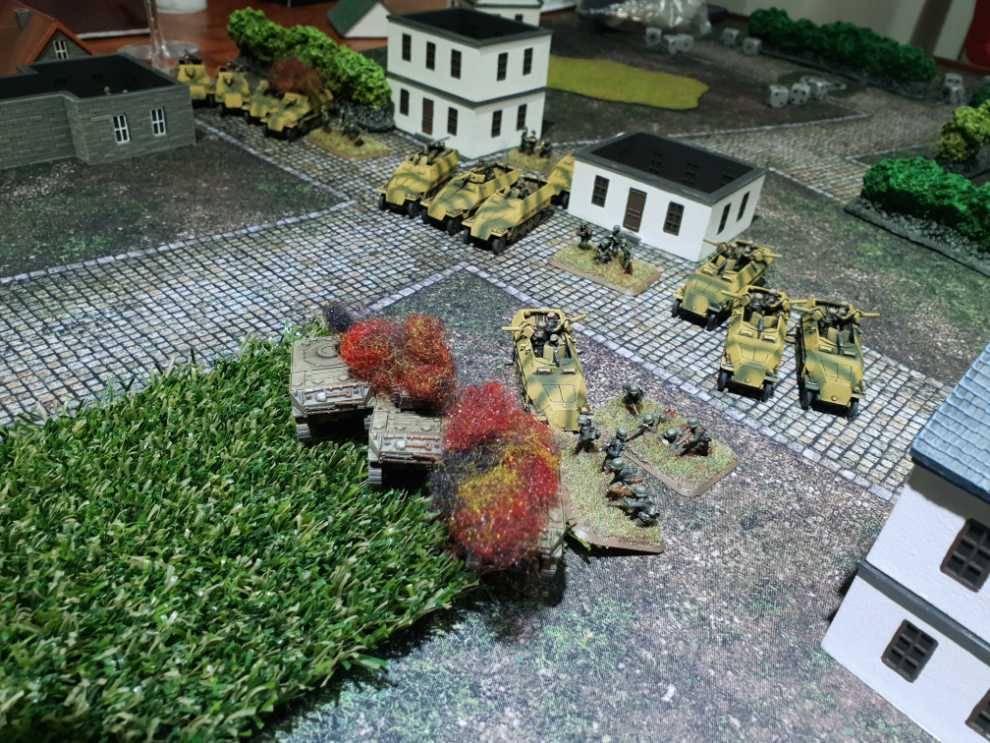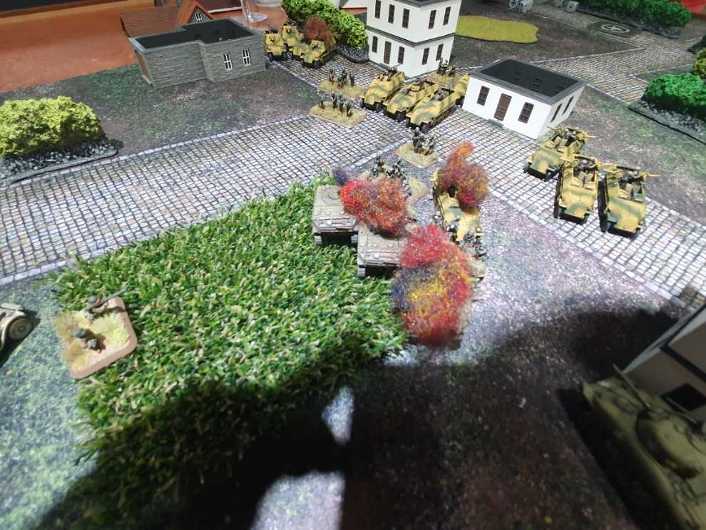 판처 그레네디어가 쏜 판처 파우스트와 하노마그가 발사한 7.5cm 포에 모두 화염에 휩쌓입니다.
