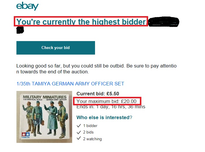 평소 이베이로 레어킷을 몇번 구매한 적이 있는데 이번에 단종된 구판 Tamiya 독일 장교셋트가 반갑게도 이베이에 경매로 나와 몇일 전 경매에 참여해서 드디어 오늘 아침에 최종 낙찰을 받았습니다. 보통 정가로 나온 구판 킷은 몇번 구매었는데 이렇게 Bid를 통해 구매하기는 또 처음이네요. 한가지 신기했던 건 전 최고 경매가를 20파운드로 크게 불렀는데, 암튼 총 경쟁자 저 빼고 2명보다 높아서 결국 원하는대로 최종 낙찰을 받았는데, 이베이에서 결제하라고 메일 날라온 걸 보니 최종 결제가격이 제가 쓴 최고 경매가 20파운드가 아닌 제품 8.8파운드에 운임 4.85파운드로 총합 13.65파운드 (한화 약 2만원)를 결제하라고 오더군요.... 판매자가 20파운드가 너무 많다고 생각해서 절충을 한 건지는 알 수 없지만 암튼 근 30년만에 이 킷을 다시 만나게 되어 기분이 좋네요. 언제 배송될진 모르겠지만 기다려봐야겠네요.