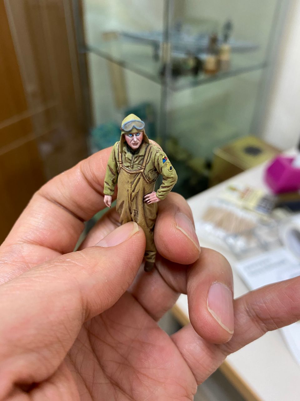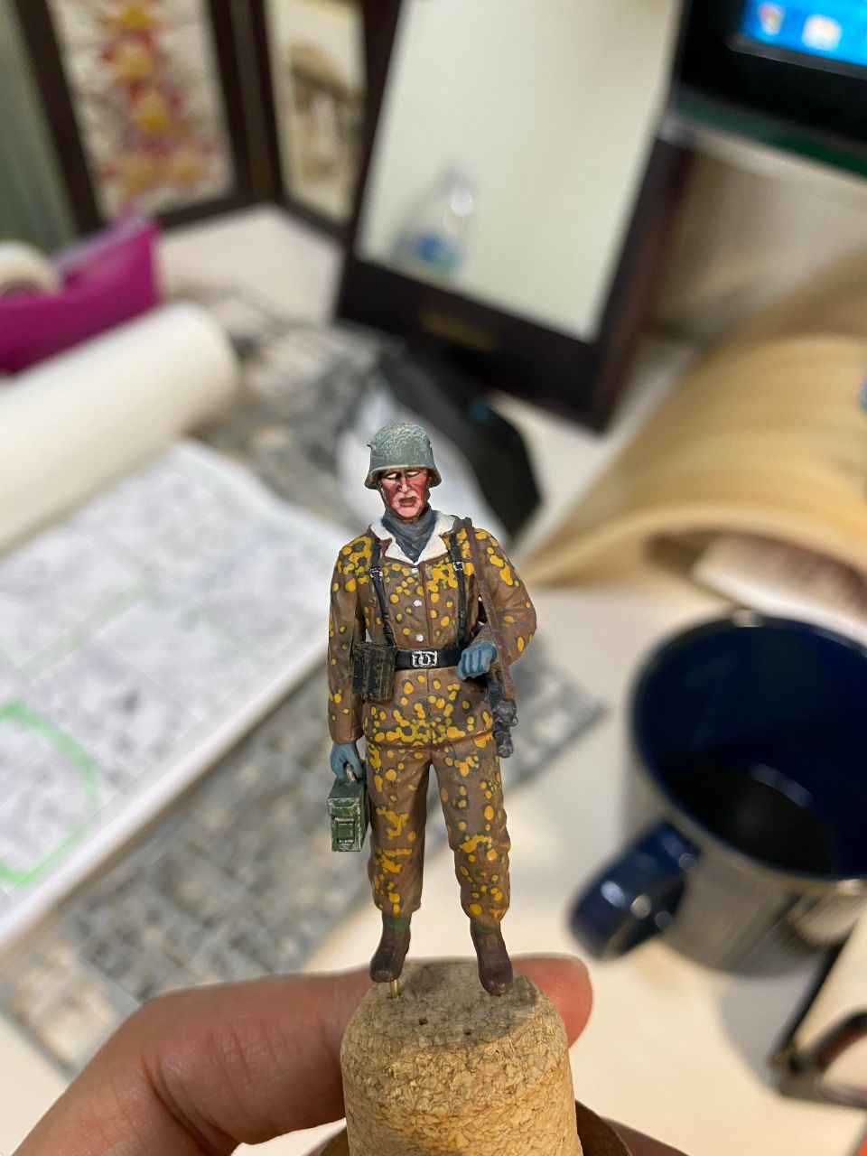 처음엔 나만의 만족할 정도로 얼굴 도색을 했는데요 전투모를 씌울때 순간접착제를 좀 많이 발랐는지 얼굴이 허옇게 색이 변질되더라고요. 순간접착제의 기화현상으로 주변이 허옇게 되는 현상있죠 그런문제인 모양입니다