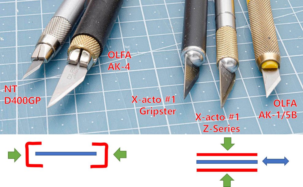 두번째 방식은 오른쪽과 같이 그냥 양쪽에서 압착해서 고정하는 방식입니다. 당연히 날이 흔들거리는 (파란색 화살표) 문제가 발생합니다. 올파 AK-1이 이 문제가 너무 극심해서 거의 쓰레기 급이고, 작토의 경우는 날을 화살표 모양으로 만들어서 양 옆 끝에서 살짝 물려주는 방식을 더해 날 흔들림을 방지하고 있습니다. (작토 손잡이에 올파 날을 끼우면 올파 날이 더 크므로 잘 맞물려서 흔들리지 않습니다)