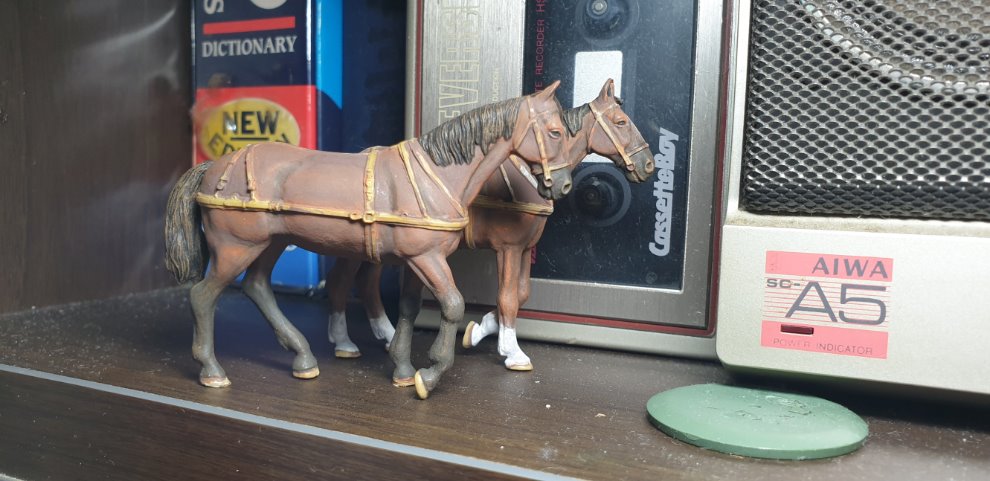 반대로 앞쪽의 말은 다리에 브라운색+검은색을 섞어 어두운 색의 마킹을 해줬는데, 말 도색을 할 때의 제 취향은 다리에 흰색 털보다는 어두운 색의 마킹인 것 같습니다.