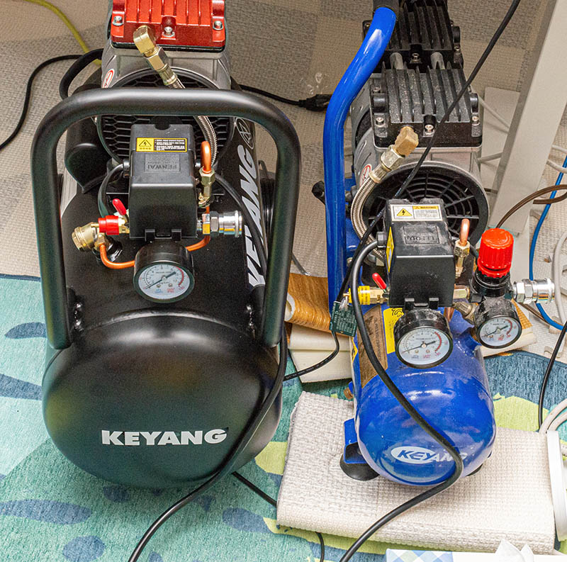 새로 산 왼쪽의 검은색 KAC-30SE 는 진정한 저소음 컴프레셔입니다. 진짜 이런 컴프는 처음보네요. 비교 평가에서 콰이어트 존이라든지 비틀벅 같은 다른 거 전부 압살하던데, 제가 써보니 진짜 명불허전이었습니다. 진동도 거의 없어서 밤에도 켜놓고 편안하게 쓸 수 있겠더군요. 계양이 저소음 컴프 시장에서 밀리니까 여러가지로 절치부심하다가 걸작을 만들은 것 같습니다. 지금까지 참다 참은 후에 산 보람이 있네요.