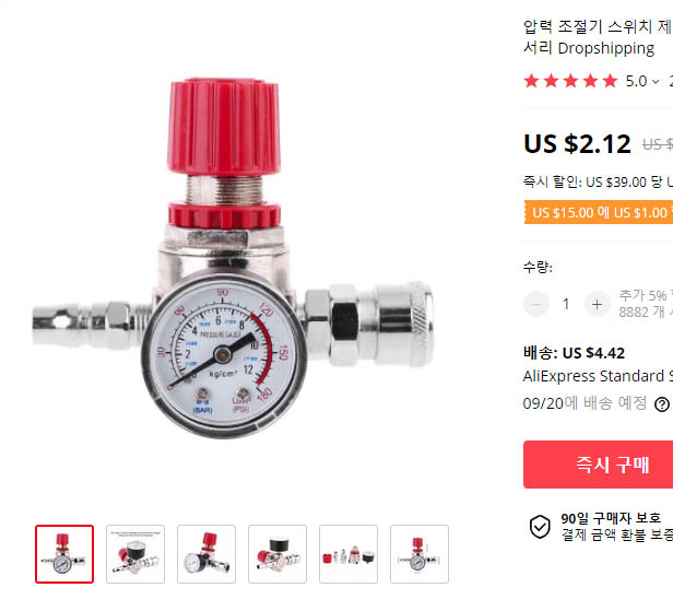 이 제품의 단점은 14만원대로 저렴한 가격 때문인지 레귤레이터 밸브(정압기)가 빠져있다는 겁니다. 8바의 압력으로 공기가 다 나와버려요;; (위 사진에서 게이지 2개 있어야 하는게 1개만 있죠)
