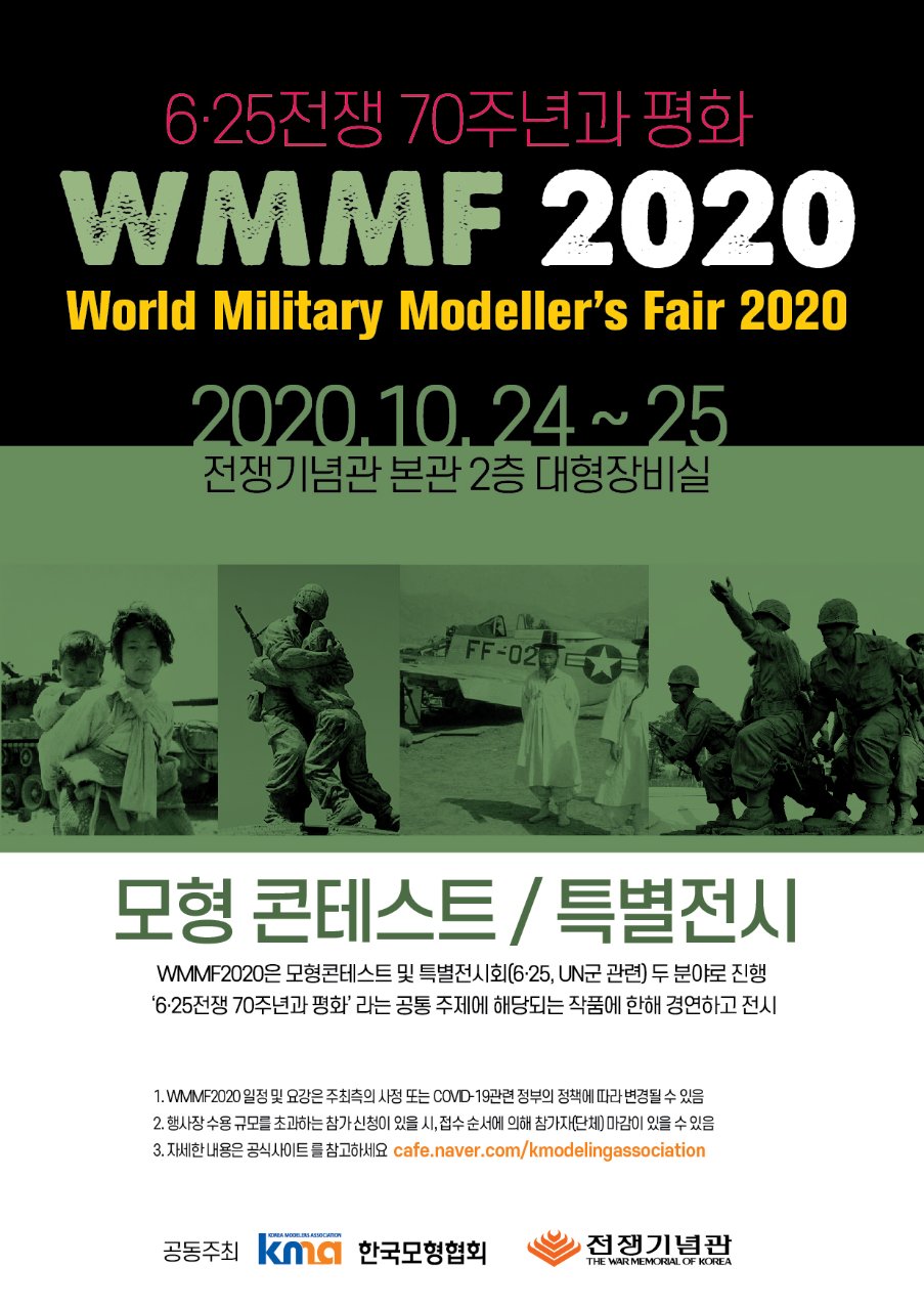 10월 24~25일 정쟁기념관에서 열릴 예정인 2020 세계밀리터리모델페어에 참가 접수를 현재 한국모형협회 홈페이지에서 접수 중이니 참가를 준비하고 계시거나 생각 중인 분들께서는 미리 접수를 해주시길 부탁을 드립니다. 미리 접수를 해주시면 대회를 준비하는데 많은 도움이 되겠습니다. 첫 대회다 보니 준비에 어려움이 많네요. 어려운 상황이지만 최선을 다해 대회를 진행하려고 준비를 하고 있습니다.