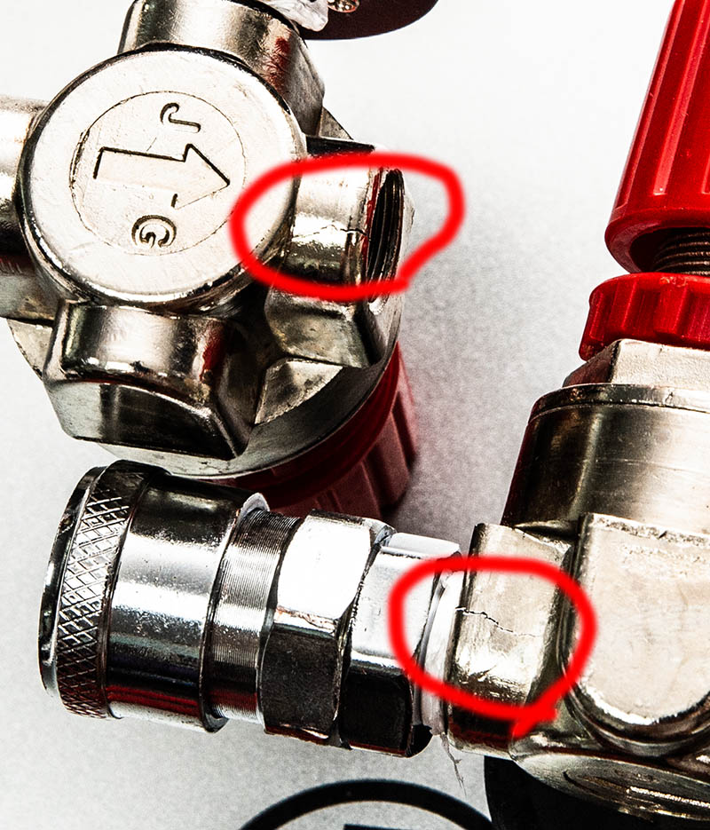 공업용 에어 콤프레샤를 에어브러쉬 용으로 누구나 쉽게 쓸 수 있도록 가이드를 만드는데, 거기에 필요한 부품 중 하나인 에어 레귤레이터 부품을 받아서 조립해보니 자꾸만 에어가 새더군요. 처음에는 테프론 테이프를 잘못 감아서 그런 줄 알았는데, 풀어낸 후 다시 테프론 테이프를 감으려고 작업하다가 딱 크랙을 발견했습니다; 둘 다 바람이 샜는데, 둘 다 쎄게 조이다가 터진 거였네요.