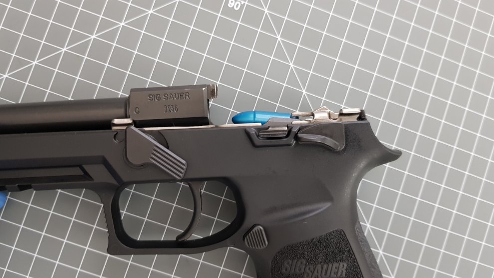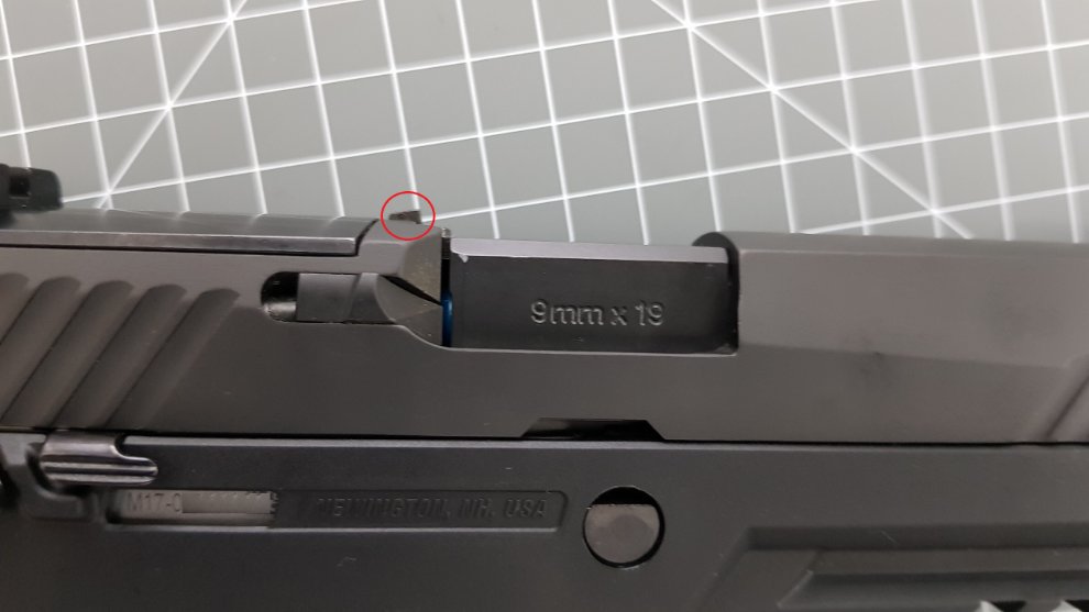Loaded Chamber Indicator라고 장전되어 있으면 슬라이드위쪽에 조그마한 돌기가 올라옵니다. 또한 Chamber와 슬라이드사이에 파란색의 연습탄이 장전된 모습이 보입니다. 이렇게 눈으로 확인하던지 아니면 슬라이드위쪽을 만져서 돌기를 통해 장전여부를 확인할수 있습니다.