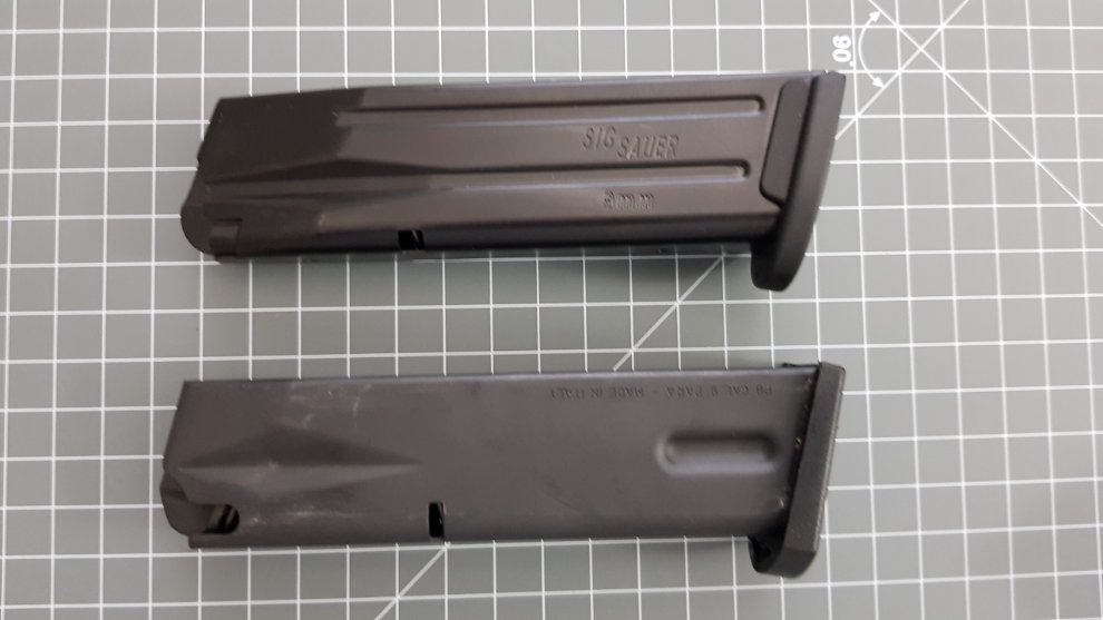 슬라이드없이 탄이 탄창에 장전된 모습입니다. 총열과 탄과의 각도가 꽤 있습니다. Beretta는 총열과 탄이 거의 평행합니다. 뻥뚫린 슬라이드와 더불어 총열과 탄의 평평한 각도로 인해 Beretta는 잼이 안나는 권총으로 유명하죠.
