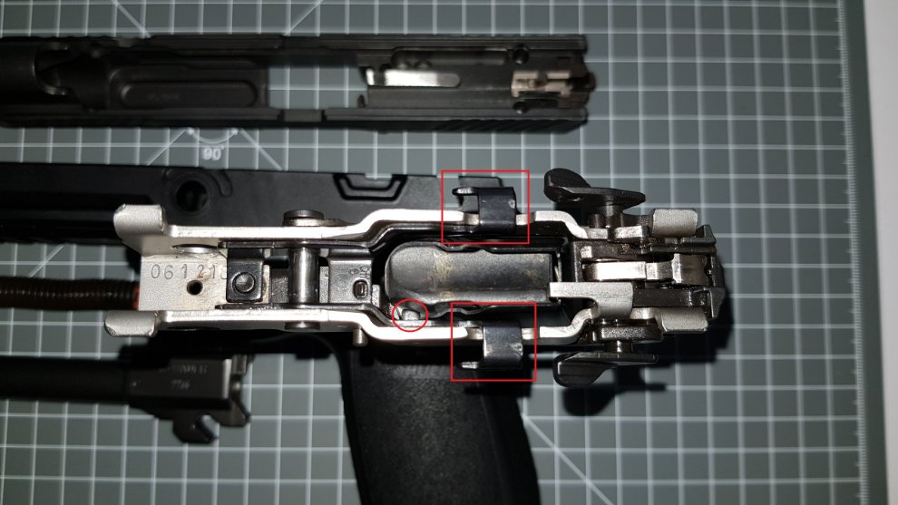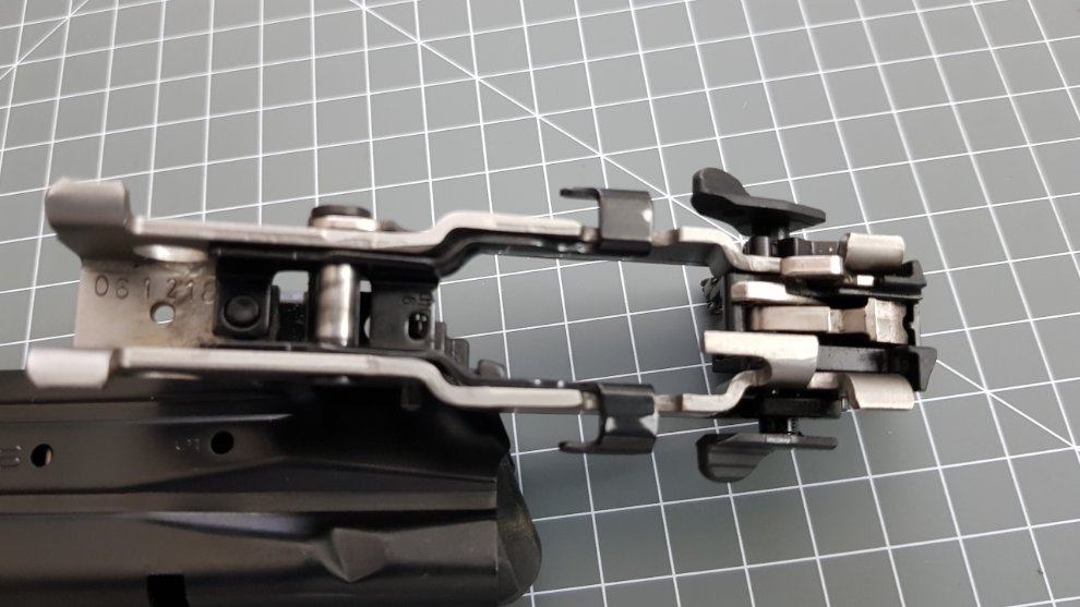 밥줘모드의 원리입니다. 마지막탄이 발사된후 magazine follower가 슬라이드멈치 안쪽에 있는 작은 돌기 (동그란부분) 를 치고 올라오면서 슬라이드멈치 전체가 올라와 양쪽 네모난 부분이 후퇴되는 슬라이드를 잡아주는 아주아주 간단한 원리입니다.