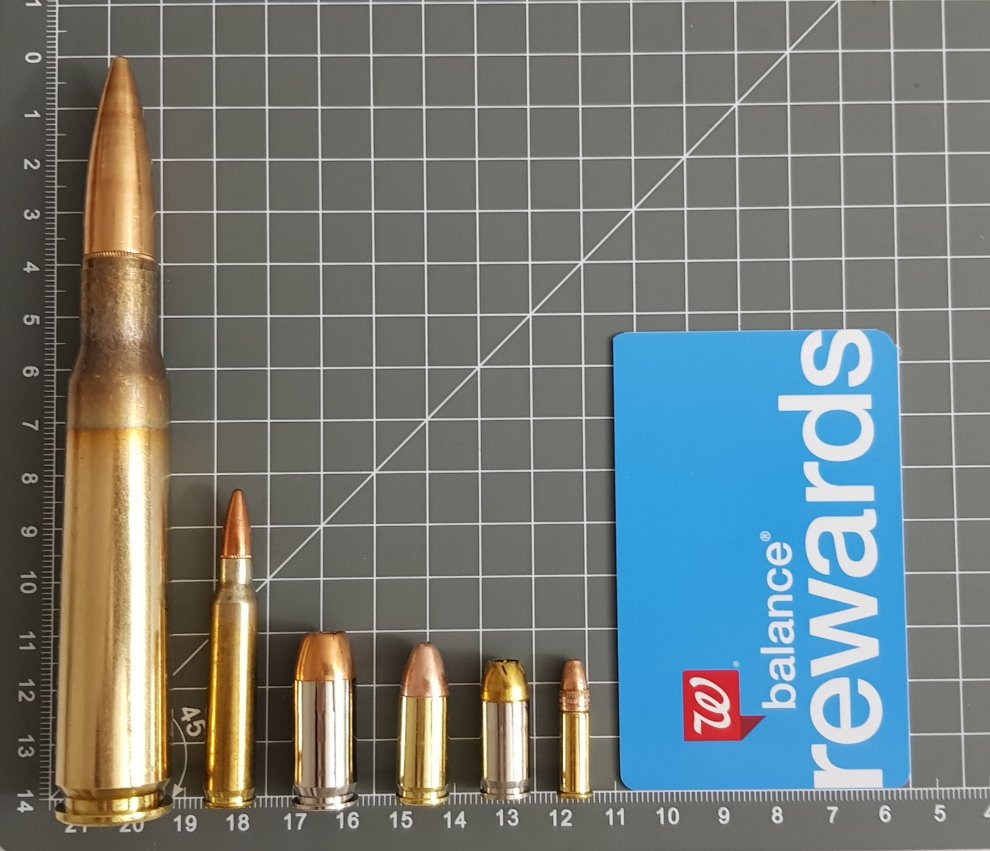 왼쪽부터 .50 BMG, 5.56 NATO (.223 Remington), .45 ACP, 9mm Luger, .380 ACP, 그리고 오늘의 주인공 .22LR입니다.