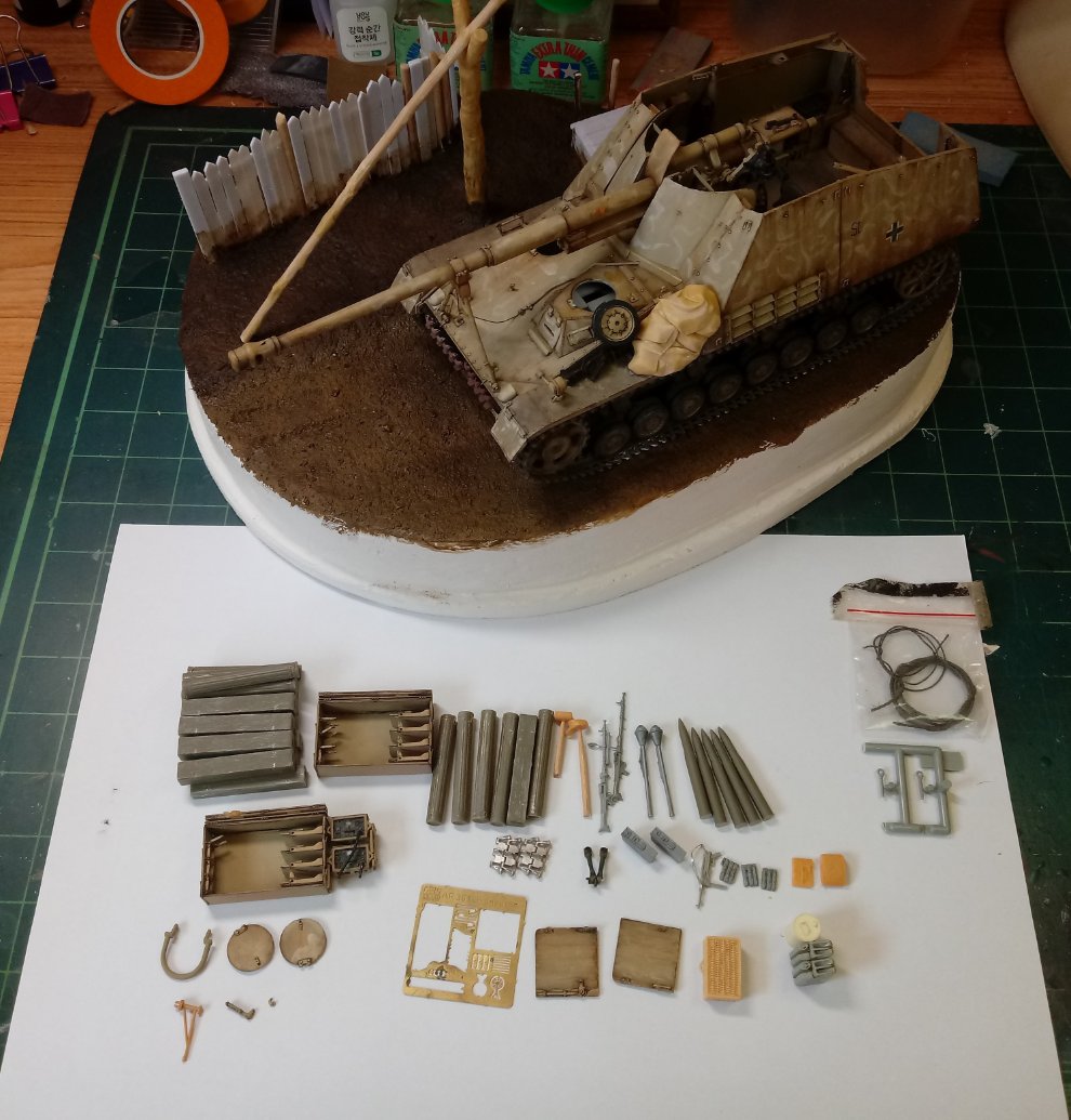 저 사진에 나와있는 악세사리도 실제 적용될 전체 물량의 2/3 정도 수준이니.... 거의 전차1대 새로 만드는 기분입니다. 추가해서 디오라마느낌이 나는 베이스와 거기에 올릴 몇가지 악세사리와 수목작업 들 까지 작업해야 하기 때문에 거의 전차 3대 정도??