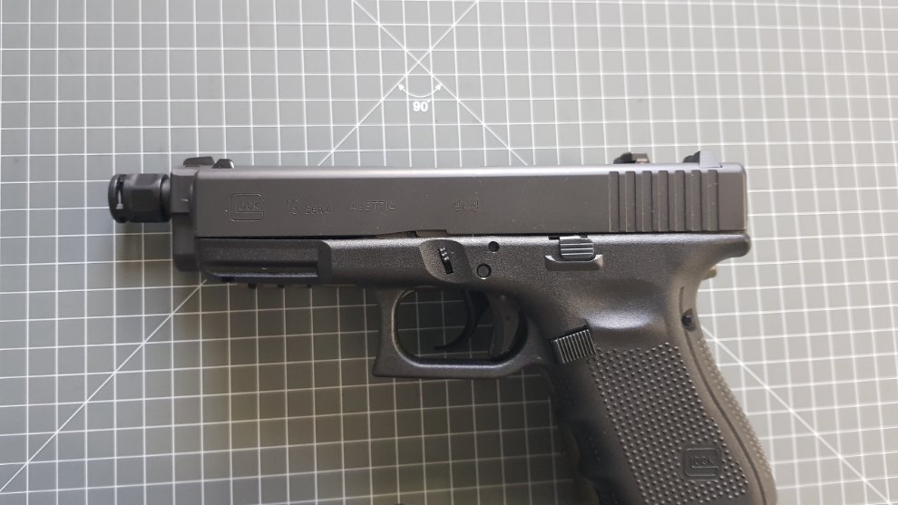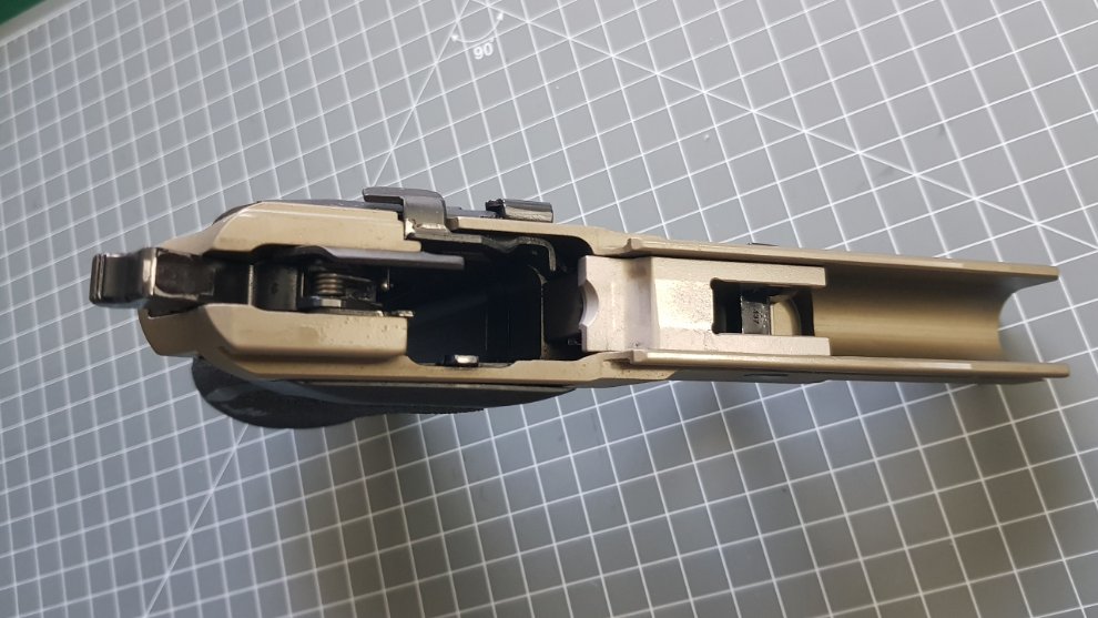 총열이 소음기를 달수 있도록 연장이 됐고 홈이 파여져 있습니다. 안전장치는 따로 없고 디코킹레버가 탄창멈치 윗쪽에 있습니다.