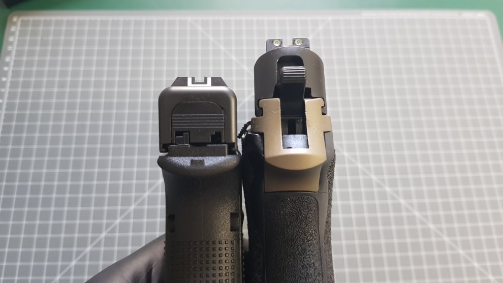 Glock의 접지면이 작다고 슬라이드를 잡고 흔들면 달그락거리는건 아닙니다만 아무래도 Sig에 비해 바디와 슬라이드사이에 빈틈이 많이 보입니다.