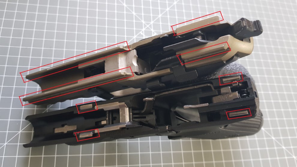 이 총의 또다른 특징은 바디와 슬라이드의 결합면이 길다는 겁니다. Sig와 glock 모두 네군데에서 슬라이드를 잡아주지만 접지면적의 차이는 비교가 안됩니다. 접지면적이 넓으면 넓을수록 좋겠지라는 막연한 생각은 드는데 총기전문가가 아닌 저로서는 두 총을 사격했을때 접지면적으로 인한 차이를 (당연하겠지만) 못 느꼈습니다.