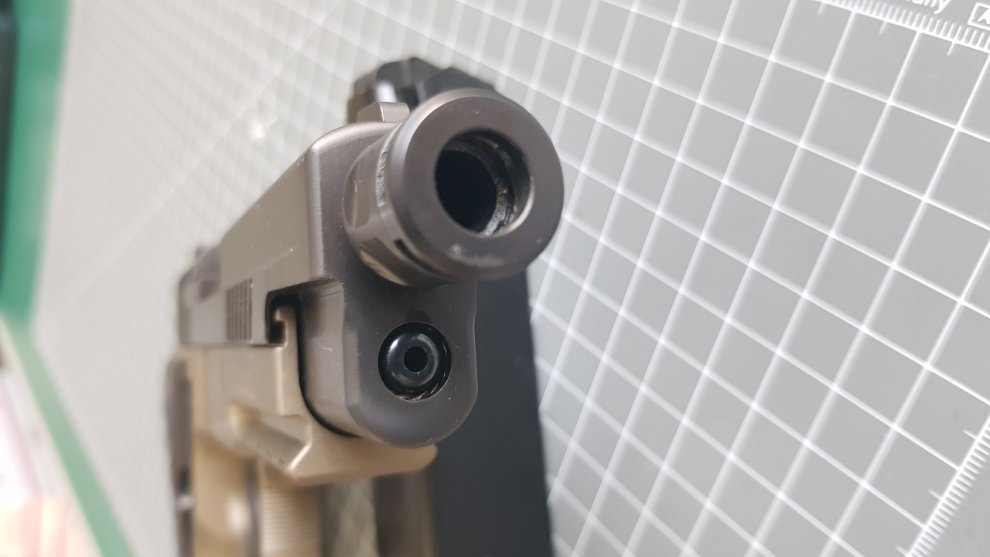 총열의 모습입니다. 총열의 표면이 이상하게 잘 까진다고 인터넷에서 여러 후기를 읽은적이 있는데 이 총열도 같은 현상이 일어납니다. 제가 신상으로 사서 고작 650발 밖에 안 쐈는데 한 수천, 수만발 쏜 총열처럼 까지는군요. 근데 정확도에는 영향이 전혀 없고 어디까지나 외관상 문제이기에 신경 안 쓰려고 합니다. 나중에 누더기가 되면 총열만 따로 바꾸면 됩니다.