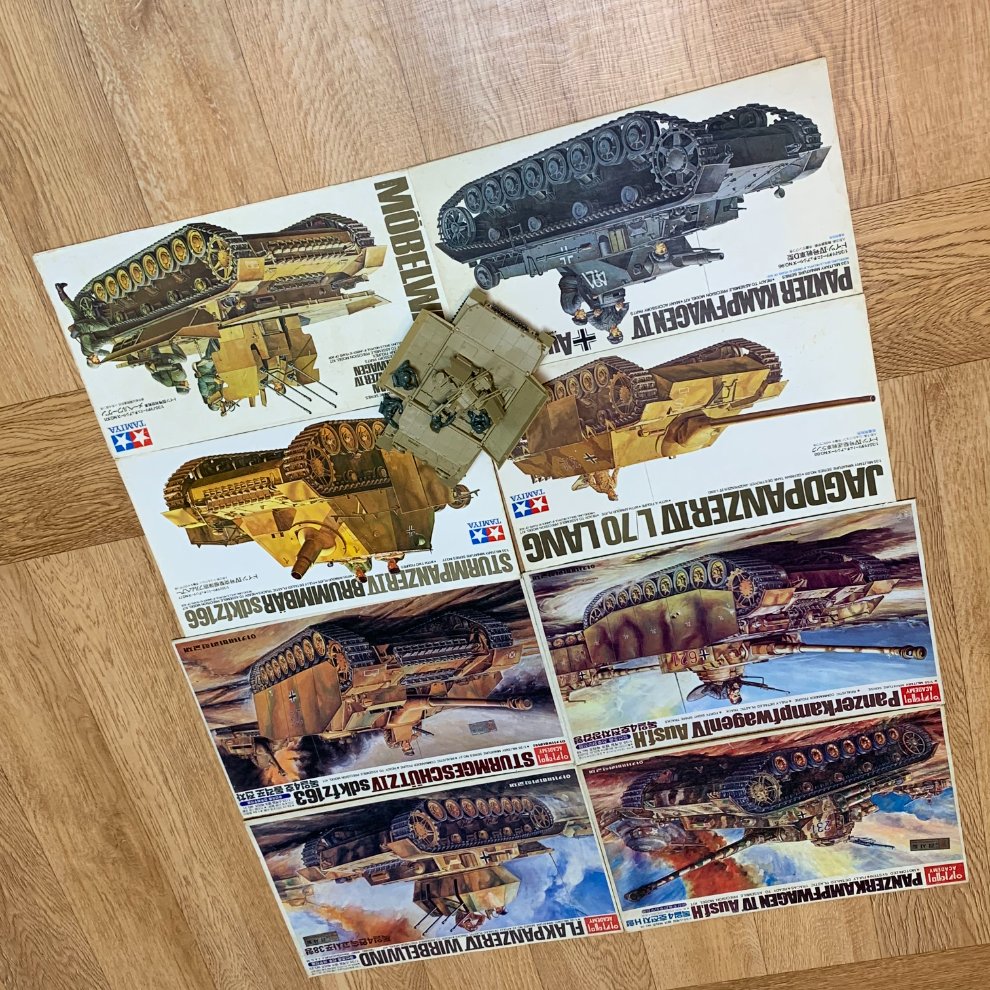 80년대 중반 어느날 문방구에서 발견한 독일 4호전차 H형. 사전 지식이 전혀 없던 저는 숫자와 알파벳으로 된 전차명에 복잡한 생각에 빠졌으니 1~3호전차는 무엇이며 몇호까지 있는 것일까? A형부터 G형까지는 또 뭐가 어떻게 다른걸까? 언젠가는 모든 형식이 다 나오리라 기대하며 일단 열심히 만들었는데 쉬르첸 장착은 장갑형이라고 나왔고 돌격포와 비르벨빈트까지 나오고 끝이더군요. 그래서 타미야 본가로 찾아가서 구축전차 랑, 브룸베어, 뫼벨바겐, D형까지 만들었습니다만 타미야 초기작들의 공통적 문제인 모터 장착을 위해 차체가 살짝 커져서 나중에 나온 모형들과 같이 두면 어색함이 너무 심해 동일 제품이 안나온 뫼벨바겐만 남기고 모두 재활용 쓰레기로 보내졌습니다.