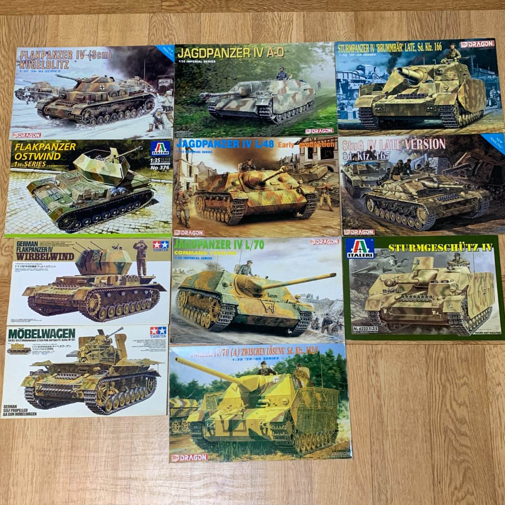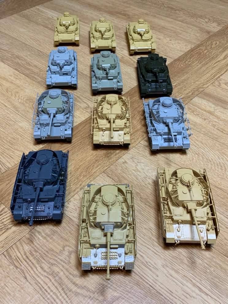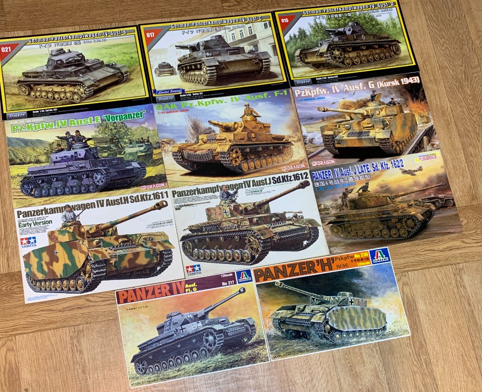 오랫동안 다른 파생형은 나오지 않다가 90년대 드래곤이 투박한 품질이긴 했지만 독일전차들을 마구 뽑아내기 시작했고 타미야도 신금형으로 내줬고 이때 같은 70년대생이지만 타미야를 능가하는 이탈레리 키트도 접해봤고 21세기로 접어들며 실력이 일취월장한 드래곤이 초기형들도 뽑아주고 마지막으로 당시 신생이던 트라이스타에서 B~D형들까지 나와 비로소 4호전차의 전 형식을 보유하게 되었습니다. 트라이스타는 부품 분할이 심했지만 그땐 그런것도 전투적으로 조립했었는데 요샌 일단 목 허리에 무리가 가더군요. 드래곤 J 후기형은 쉬르첸을 거의 에칭으로 재현했는데 당시 순접 품질이 별로였는지 툭하면 인수분해가 되어 나중에 플라스틱 부품으로 교체된걸 다시 사서 만들고 지금까지 웬만하면 에칭파트를 기피하는 트라우마를 주었네요.