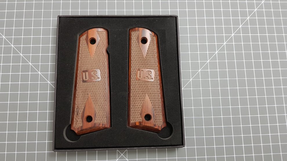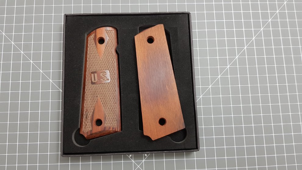 파카라이즈 도색처리로 총전체가 무광이기에 Colt 1991처럼 번쩍이는 맛은 없지만 나름 차분해 보이는게 매력포인트입니다. 그런데 그립이 너무 밋밋해보이고 플라스틱 재질이어서 교체하고픈 마음이 있었는데 마침 온라인에서 Rose Wood로 만든 괜찮아 보이는 그립을 발견하고는 얼른 구입했습니다. 가격이 $28이어서 큰 기대는 안했는데 막상 받고보니 생각보다 포장상태도 고급지고 품질도 좋습니다.