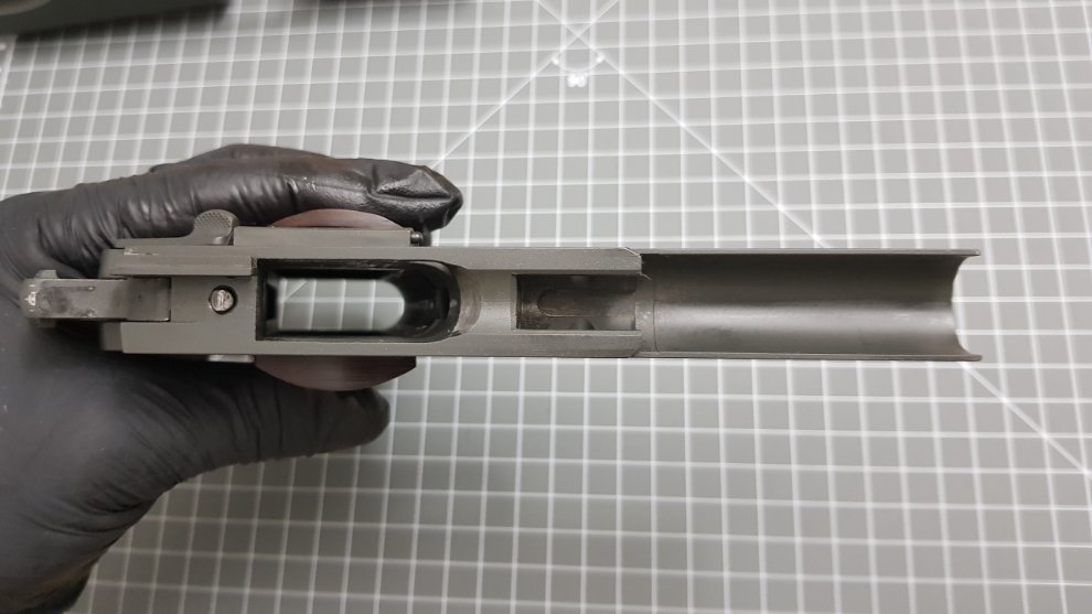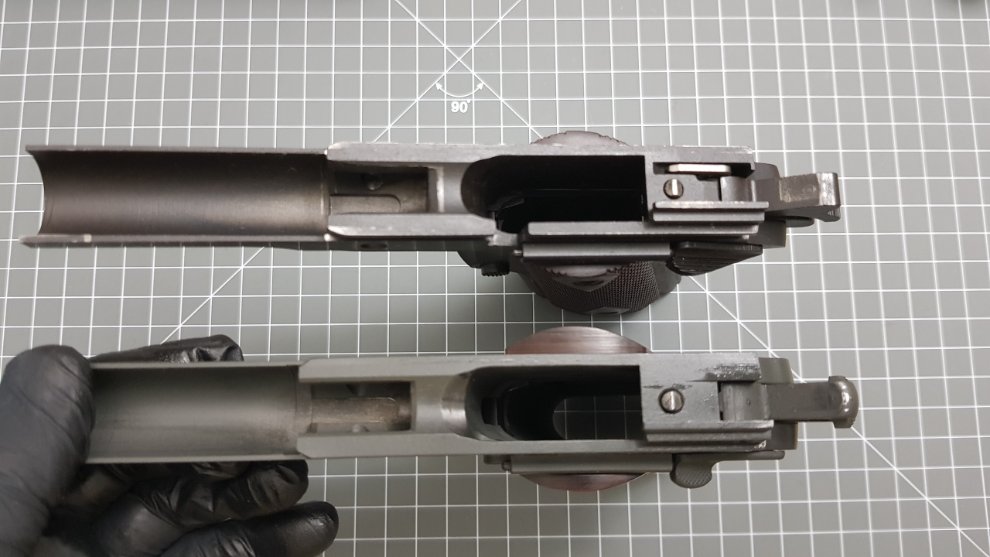 윗쪽이 Colt 1991으로 해머앞에 Firing Pin Block을 밀어 올려주는 가느다란 쇳조각이 있습니다.