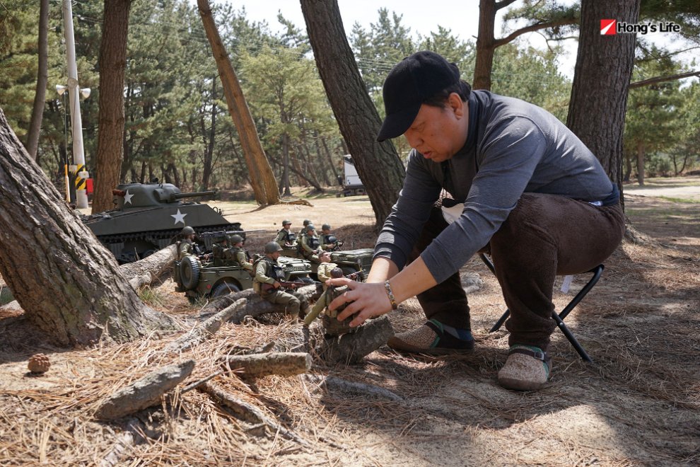 친구는 본인이 소장하고 있는 피규어들을 커스터마이징 작업을 통해 좀더 디테일을 높혀주었고 저는 그렇게 완성된 피규어에 웨더링을 넣어 자연과 어우어리지게끔 구성을 하였습니다. 전차나 기타 장비의 제작은 킷트화 되어있는 것을 구입하여 제작하고 도색하고 웨더링을 넣어주었는데 이부분이 저의 역활이었습니다. 저는 모델러니까요.