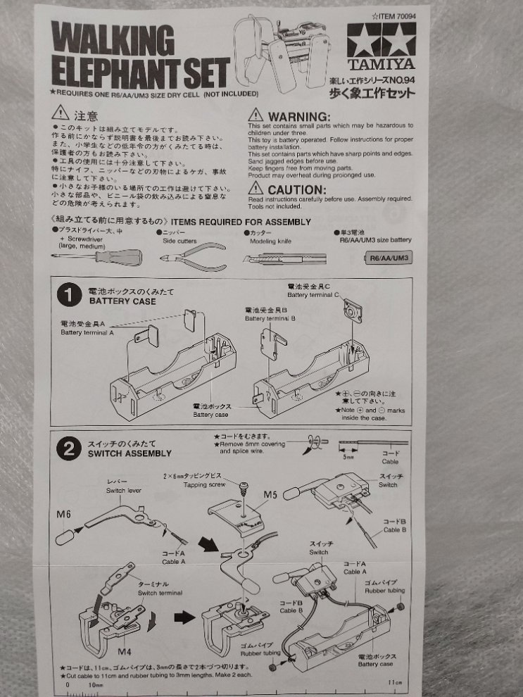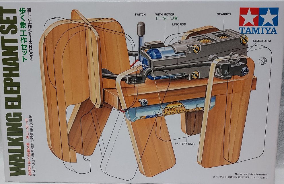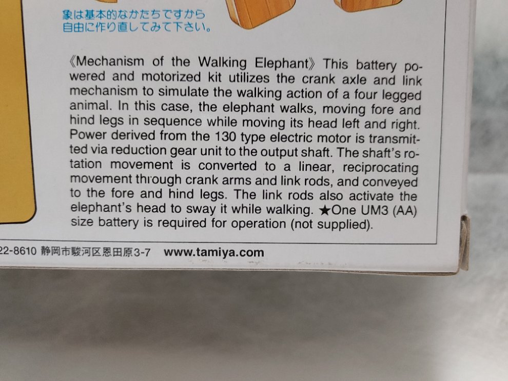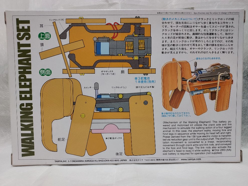 이 세트는 조립해야 하는 모터라이즈 걷는 코끼리 모형의 파츠를 포함하고 있습니다.