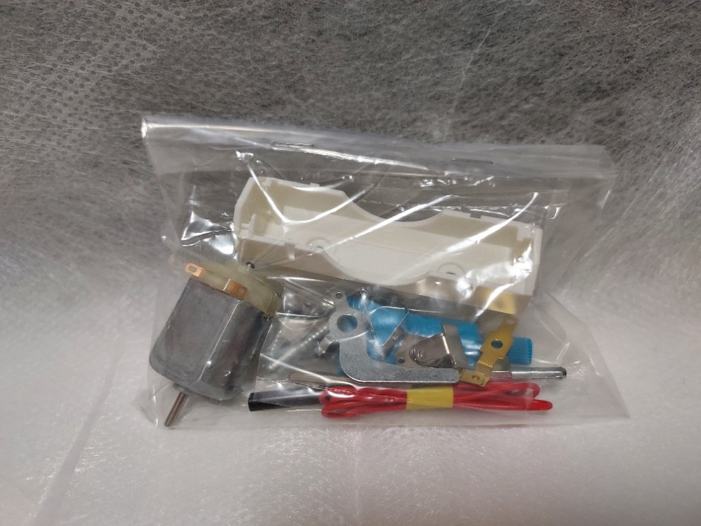모터, 건전지박스, 접지금속, 스위치, 전선 등이 포함된 꾸러미입니다.