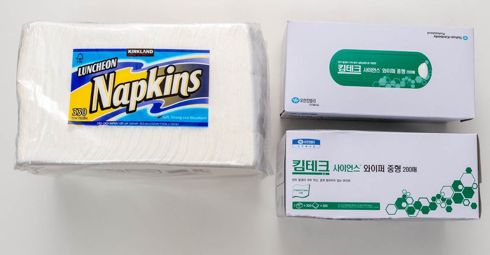 말로만 듣던 사이언스 와이퍼를 구입한 기념으로 기존에 쓰던 코스트코 커클랜드 냅킨과 비교해봤습니다.