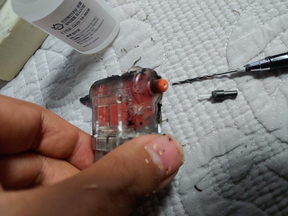 두번째 개발품입니다. 샤프에 드릴을꼽은뒤 샤프주둥이를 그라인더나 뺀지등으로 잘라서 강력접착제로 붙여 버렸습니다.뒤로 밀리지도않고 쓰는데 전혀 지장없이 잘됩니다.