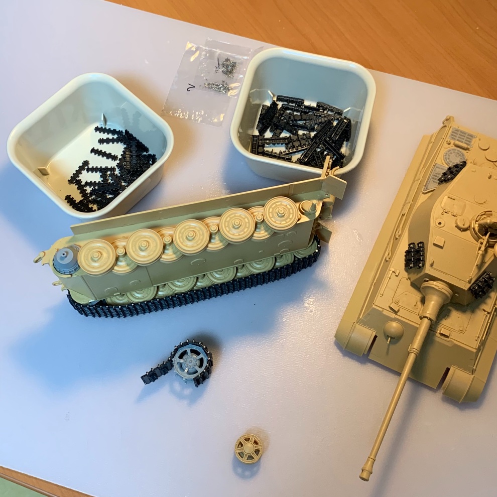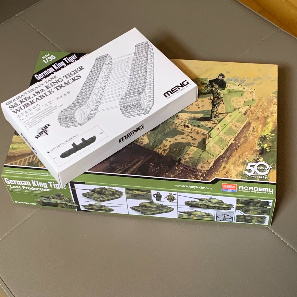 얼마전 L마트 행사로 재구매한 킹타이거가 생긴 김에 이번엔 가동식 서스펜션을 활용해보려고 Meng사의 별매 궤도를 구매했습니다. 스프로켓 이빨 수 차이로 호환이 안되는 문제가 있지만 오래전 드래곤 포르쉐 야크트티커를 만들고 남은 부품이 한 세트 있어서 별다른 수고 없이 바로 장착했습니다. 잘 맞더군요. 사실 아카데미 킹타이거는 가동식 개조가 쉬운 구조이지 가동식은 아닌데 어느 위키에선 이걸 또 만들다 빼먹었다고 비판하더군요. 별로 좋은 소리를 못들어서인지 판터같은 후속작에선 이런 구조가 사라졌습니다. 제가 연결식을 시간 잡아먹어 싫어하지만 이런 가동식은 만들고 움직이는걸 보면 고생이 싹 사라집니다.