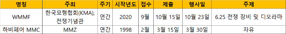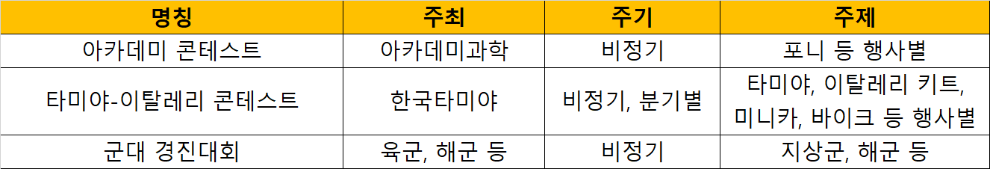 그 외 비정기적인 행사도 매년 소소하게 열리고 있는데, 타미야가 올해 2건으로 꽤 많은 편이고 아카데미는 뭐... 나라에서 하는 행사는 상금이 두둑한 편이긴 한데 몇년 주기고 2달 전에 공고하기 때문에 찾기 어려운 편입니다.
