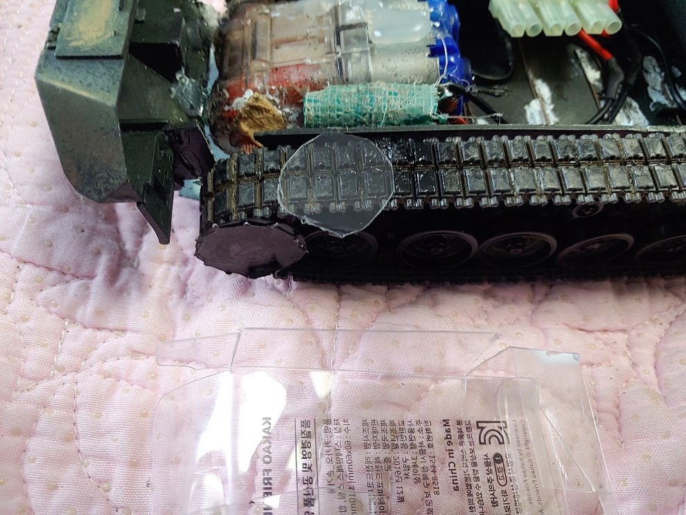 어차피 뚜껑덮으면 바퀴가 잘안보이는데 투명판에 블랙으로 칠한뒤 바퀴사진을 미리찍어 크기에 맞게 포토삽 등으로 명암조절뒤 프린터한뒤 가위로 잘르고 붙여주면 더욱 좋습니다.전 실패해서 보시다시피 엉성한 바퀴가 되네여~어차피 사이드 스커트가 있으므로 그냥 패스~