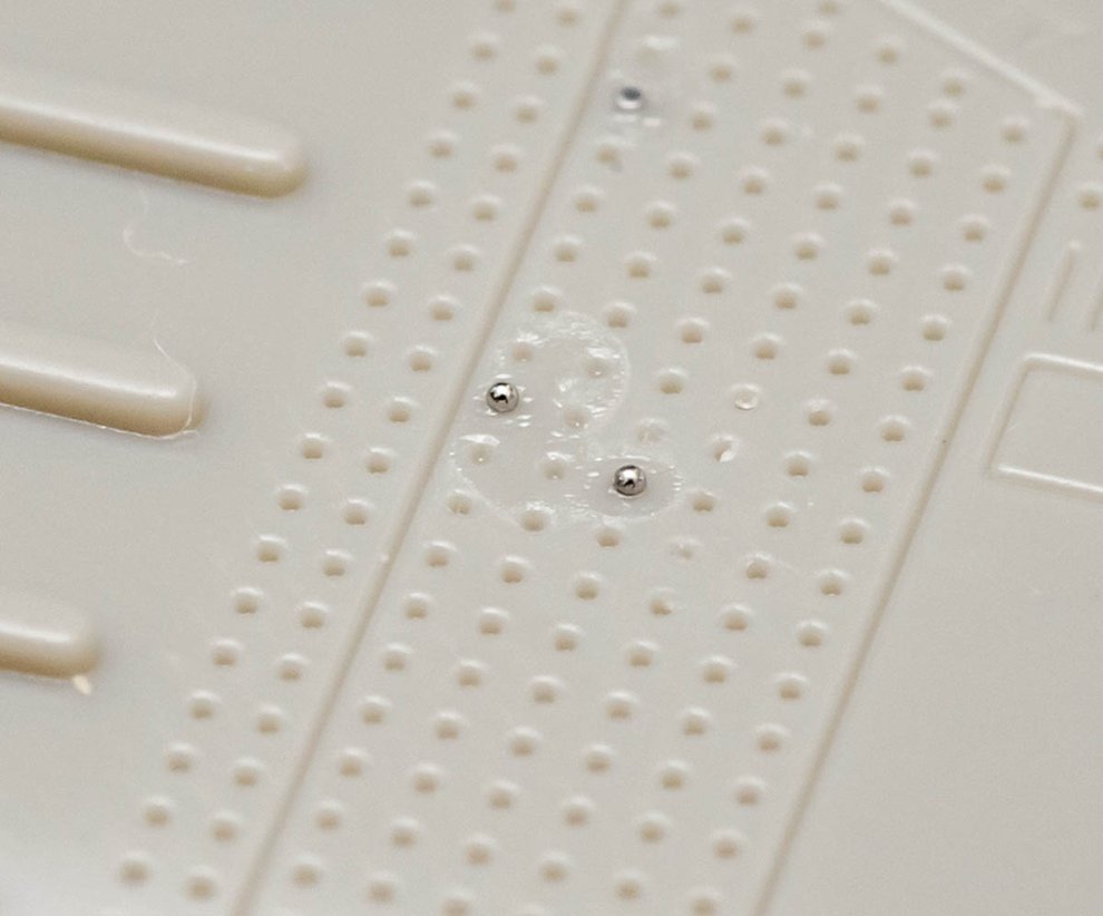 0.25mm 리벳볼을 올리고 무수지 본드를 바르니 잘 접착되었습니다. 워낙 작아서 작업하기 만만치 않네요.
