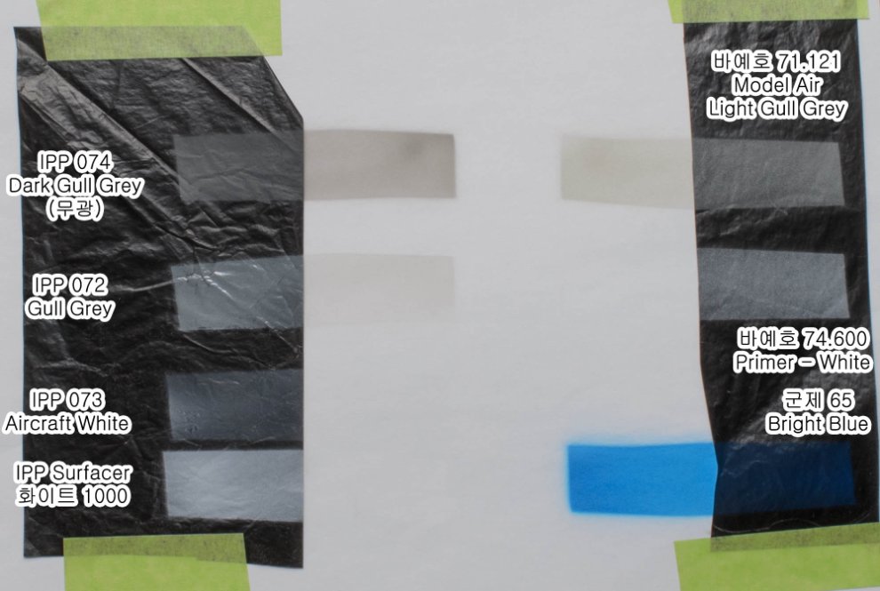 반면 제가 불만을 품은 IPP 073 에어크래프트 화이트는 한번 더 왕복했는데도 뿌린 건지 아닌지 알 수 없을 정도였습니다. 흰색이라 해도 프라이머 용도로는 절대로 못 쓰고, 배경색에 엄청난 영향을 받으므로 사전에 프라이머 색상까지 철저히 준비해야 잘 쓸 수 있겠습니다.