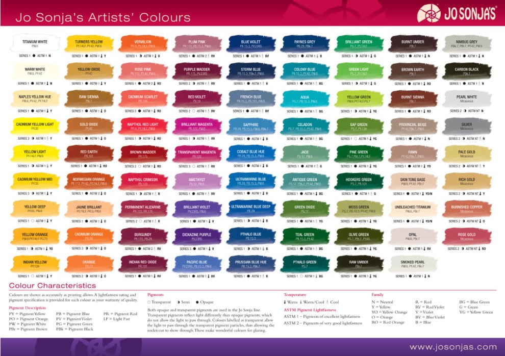 이번 글의 핵심인 투명도는 아크릴 물감의 경우 카탈로그와 물감마다 잘 적혀 있습니다. 조소냐는 Pigments 라는 항목으로 물감마다 ●-불투명 ◑-반투명 ○-투명 으로 잘 분류되어 있고, 제가 본 유튜브에선 초보자는 밑색이 잘 덮히는 불투명만 먼저 사라고 권장하더군요.