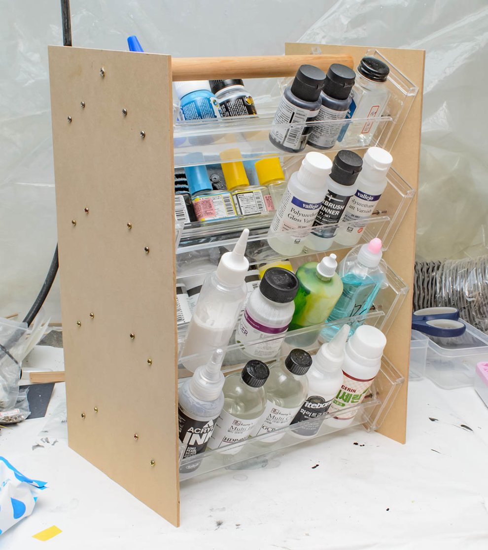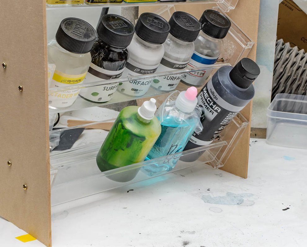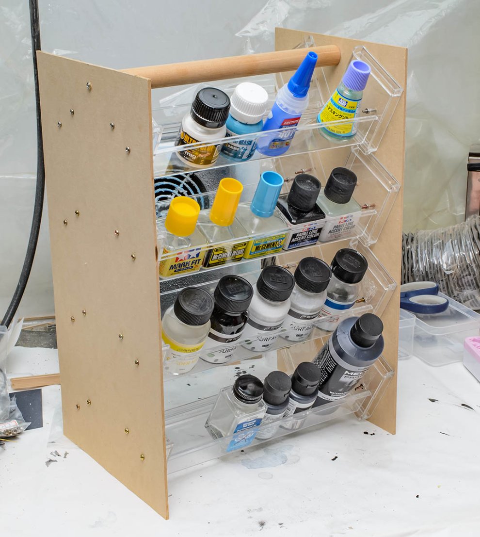 전부는 아니지만 대부분의 도료통을 끼울 수 있게 되었습니다. 일반적인 60ml, 높이 9cm 이하 도료를 쓰신다면 칸마다 높이를 10cm 씩 주고 수평층으로 설계하시면 높이는 40cm 로 똑같고 폭은 좁아지므로 공간효율적이고, 라벨도 보여지므로 훨씬 편할 겁니다.