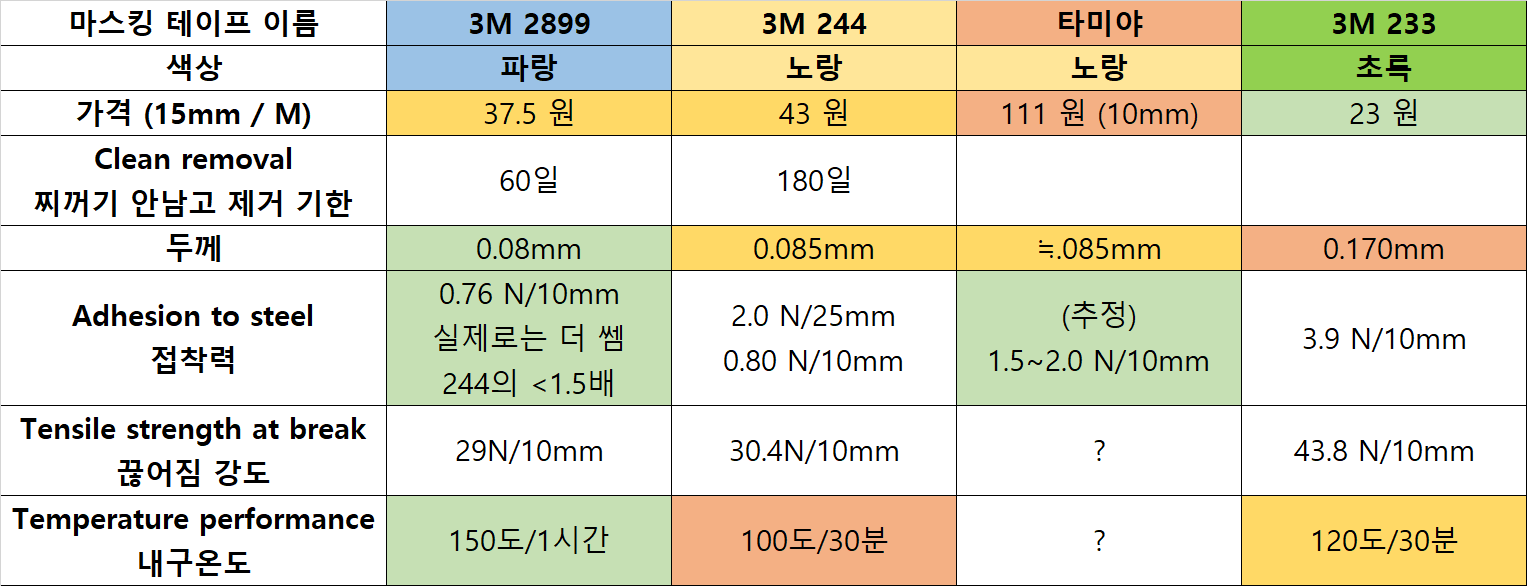 접착력은 일반 시중 테이프는 지나치게 강하여 나중에 떼어낼 때 밑도장까지 다 뜯어내는 경우가 허다합니다. 모형용 마스킹테이프는 접착력을 적당히 줄여놓고 떼어낼 때 접착성분이 남아나지 않도록 세팅한 전용 제품입니다. 모형용으로 으뜸으로 치는 타미야와 거의 동급으로 2899가 있고, 244는 지금까지 써온 결과 접착력이 타미야, 2899보다 떨어졌습니다. 233 은 매우 강하여 밑도장이 아슬아슬하게 떨어지기 직전의 접착력입니다. 부품을 단단하게 고정할 때 씁니다. (포토에칭 부품을 세워서 도색하는 등)