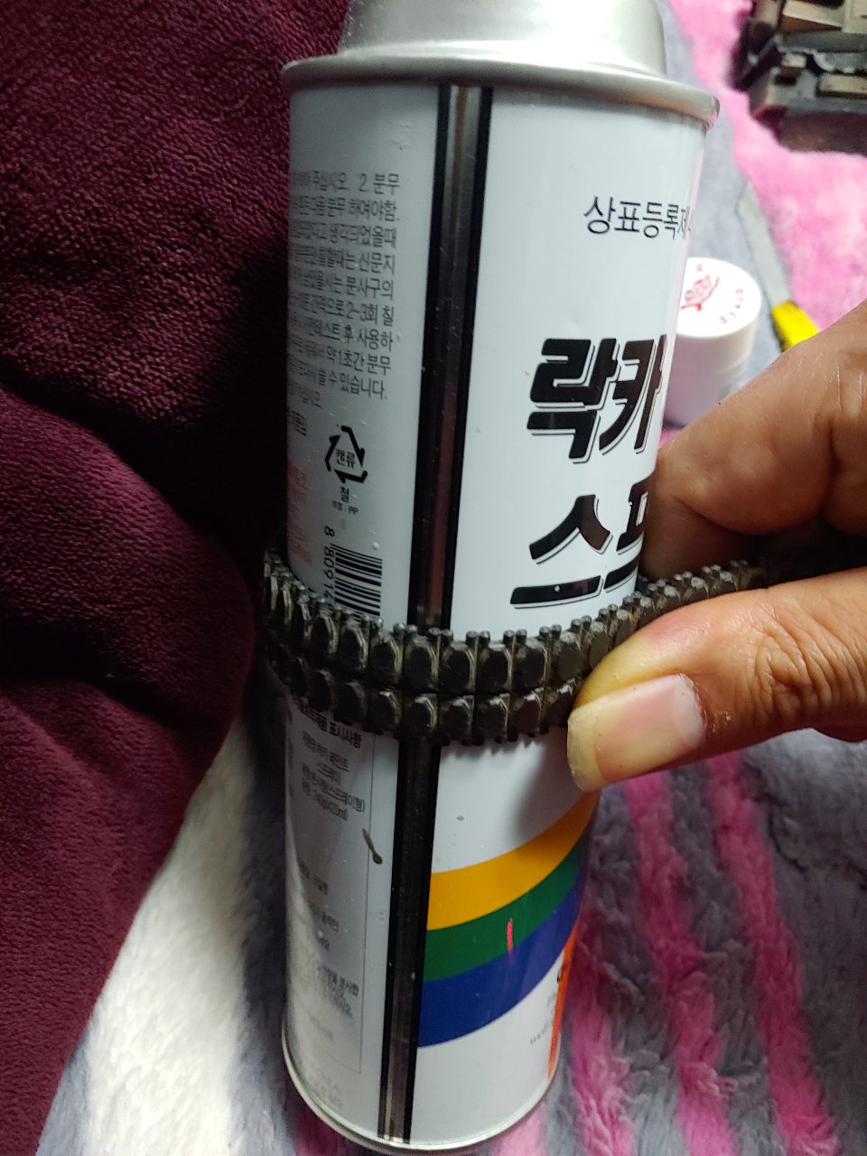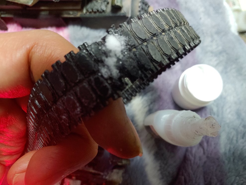 만일 왼쪽이 빠르고<즉 왼쪽으로 쏠린다면>오른쪽이 느리다면 두번째 사진처럼 둥그런 통에 궤도를 감아 손으로 조여주어 오른쪽 궤도를 늘려주면 됩니다 중간중간 테스트를해가며 서서히 늘리는 양을 체크 하시기 바랍니다.반대로 왼쪽이 느리고 오른쪽이 빠르다면 왼쪽을 늘려주면 되겠죠 보통 이정도로 비례제어가 손쉽게 끝납니다 하지만 또다른경우가 있을수있는데 아무리 오른쪽을 늘려줘도<궤도도 늘려주는데 한계가 있을수도있고...> 왼쪽이 빠르게돌아 왼쪽으로 쏠린다면 이것을 타이트하게 설정하여 천천히 돌게할려면 궤도의 한마디를 끊고 붙여주면됩니다.붙이는방법은 윗사진처럼 강력접착제를 붙일만큼만 묻혀줍니다 하지만 강력접착제는 느리게 굳으며 굳더라도 쉽게 떨어지는데요 이때 베이킹 소다를 강력 접착제 위에 뿌려주면 더욱 빨리굳습니다.이때 한번더 접착제를 소다에 먹여주면 더욱 단단히 굳습니다.나중에 생각날때마다 붙인 부분을 강력접착제로 더먹여주면 끊어질일 없을것 같습니다.타미야 강력접착제 경화제는 비싸기만 비싸지 소다를 이용하여 붙이는 방법보다 좋을것도 없는것 같습니다.