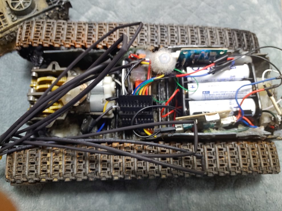 건전지 6개를 다 짚어 넣으면 9v가되는데 9v도 위험하다고 판단되어 한칸을 비운뒤 그앞자리에 전선을 연결하여 7.5v만 채웠습니다.7.5v가 이상적인데 좀더 안전할려면 6v가 좋을듯하지만 이럼 탱크가 조금느립니다.6v로만 하시고 맘에 안들면 7.5v로 하시되 그이상은 권하질않습니다.