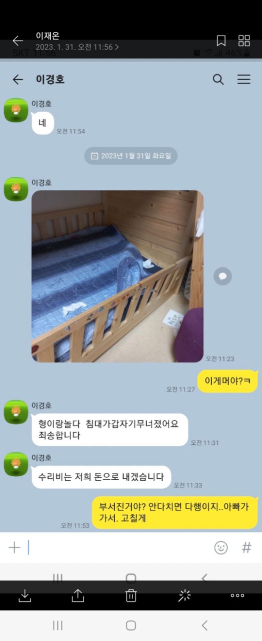 오늘 직장 후배가 아들한테 온 톡 내용을 보여줬는대 대박 입니다 침대 부수고 혼날