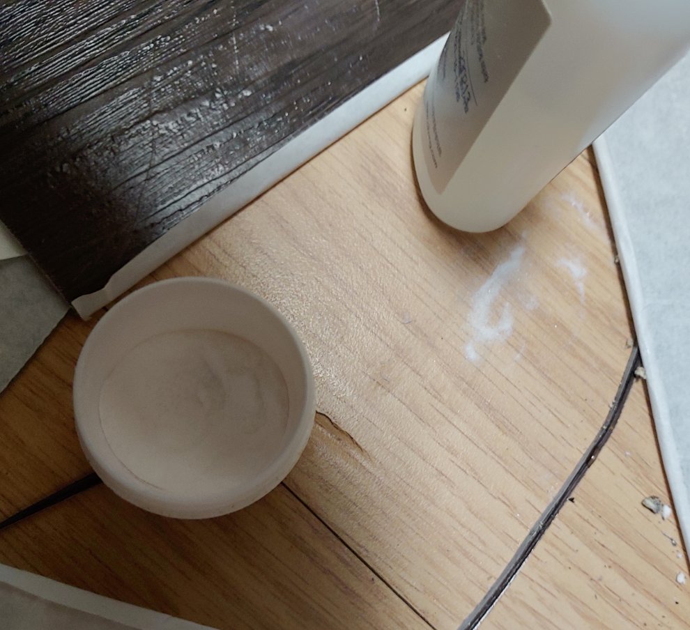 바닥에 묻었을때는 강력접착제 제거제 +식소다 +소량의물을 뿌려주고 섞어준뒤 1시간쯤지나 프라스틱끌로 벳겨내면 더잘벗겨집니다.