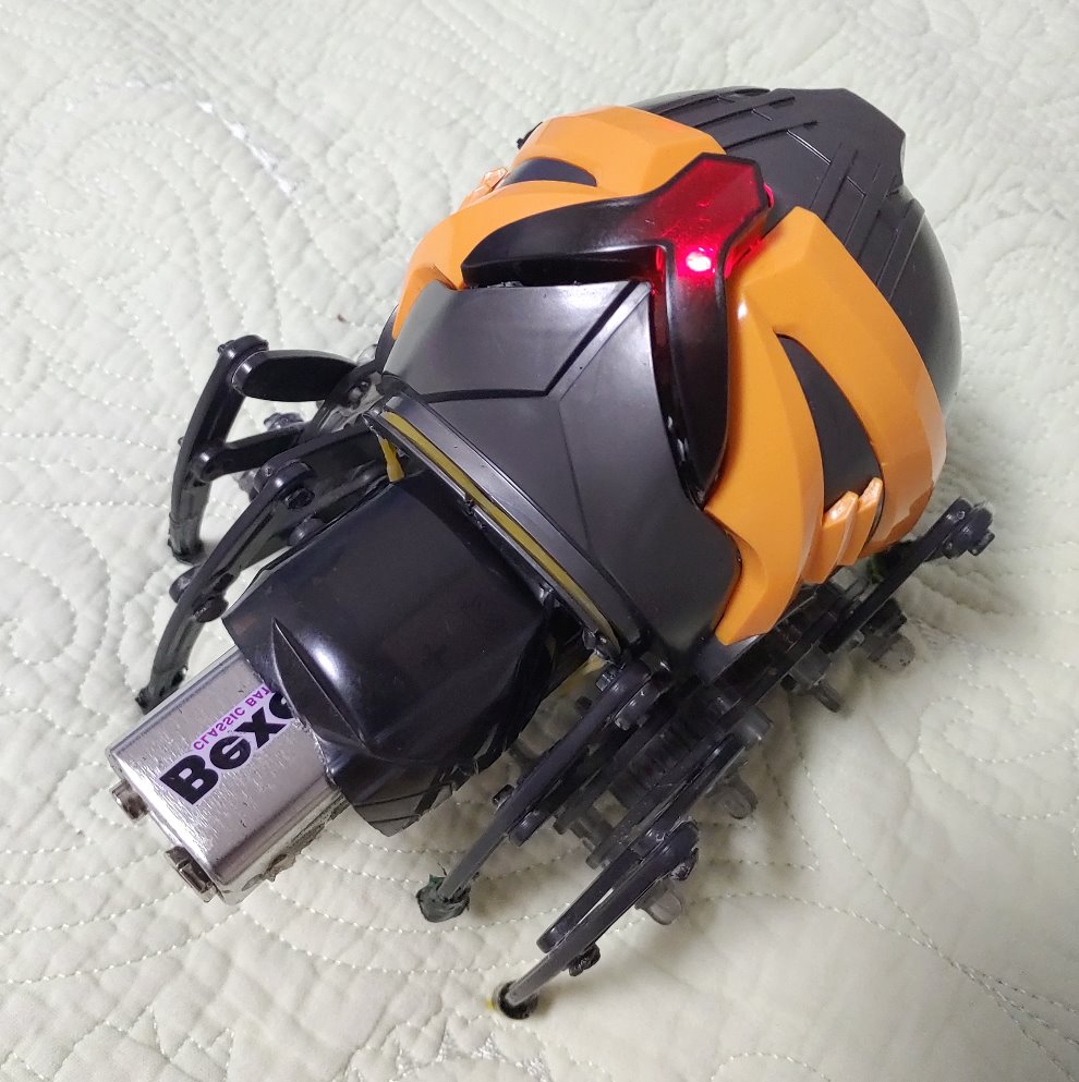 바디가없어 로봇의 몸통을 쒸어 거미의 바디를 만들었습니다 로봇 몸통은 아이들용 춤추는 댄싱머신 트랜스 포머입니다.거미의 머리는 9v 건전지 크기가 커서 전지가위로 잘라 사용 했습니다.
