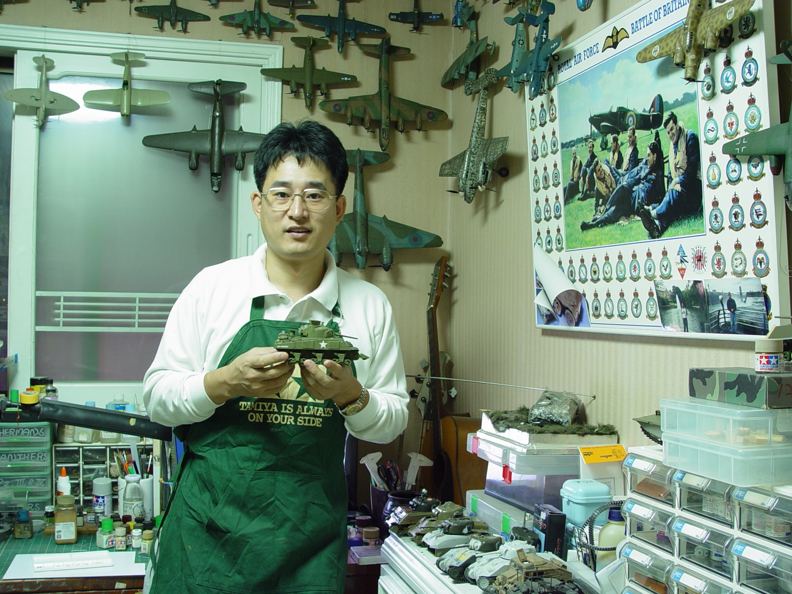PS: 사진은 2002년에 제 방에서 집사람이 찍은 것인데, 사는 곳은 지금은 두번 더 이사 했습니다. 두번째 시즈오카를 다녀와서 피크먼트를 열심히 시도하던 시절이었지만, 그 당시에도 비행기 만들기를 더 좋아했던 것 같습니다. 셔먼을 많이 만들던 시절이라서 미완성 셔먼들이 보이고 키타와 베이스키타도 보이지만 악기는 이미 손을 놓은 시절이었스습니다. 집에는 별난 어린애들이 3명이나 있어서 퇴근 후에 애들과 놀고 재우고 나면 모형 작업을 하러 갔는데, 새벽까지 모형을 만들다보니 매일 잠이 부족했던 기억이 납니다. 그래도 애들 어릴 때가 인생에서 제일 행복했던 것 같습니다. 요즘 젊은 아빠들은 더 잘하고 계시겠지요?