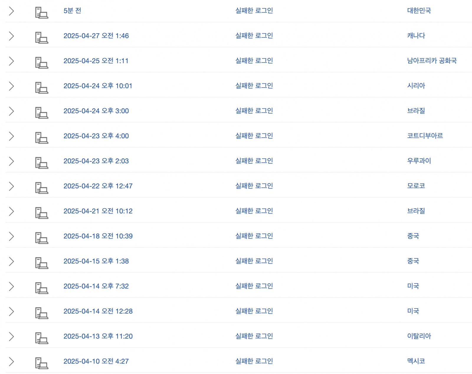 제 마소 계정 로그인 상황입니다. 이렇게 많은 로그인 시도가 있습니다. 우측에 보면 다양한 나라에서 시도 중인데 우회 경로로 생각됩니다.