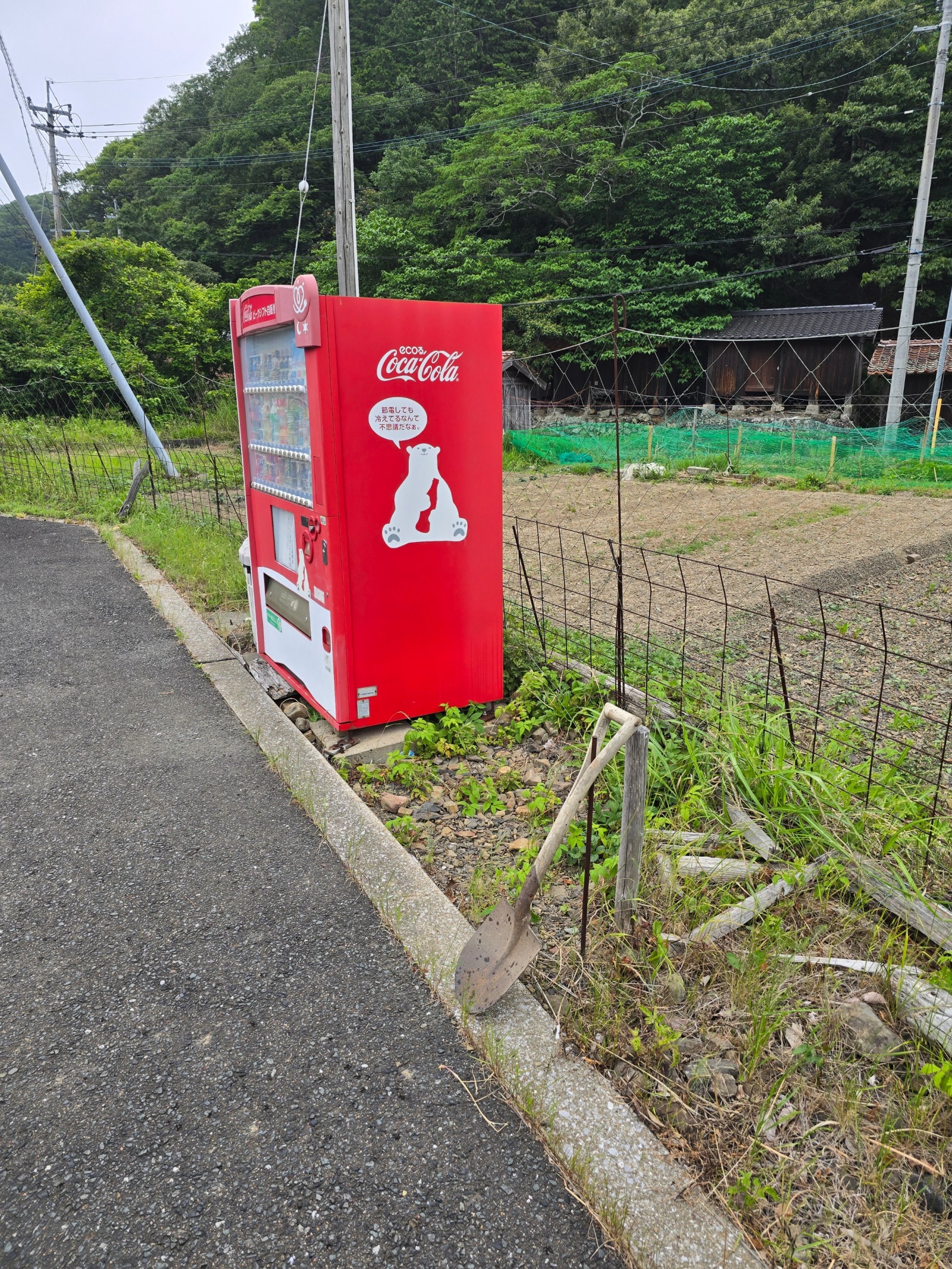 쓰시마는 상당히 시골이라 이즈하라를 제외하면 변변한 편의점도 없습니다. 구멍가게도 없고요. 그것을 대신하는 것이 정말 뜬금없는 곳에도 서 있는 자판기입니다. 이 자판기도 밭을 관통하는 도로가에 외로이 서 있었는데 문제는 저 삽입니다. 저 삽의 용도는 무엇일까요?