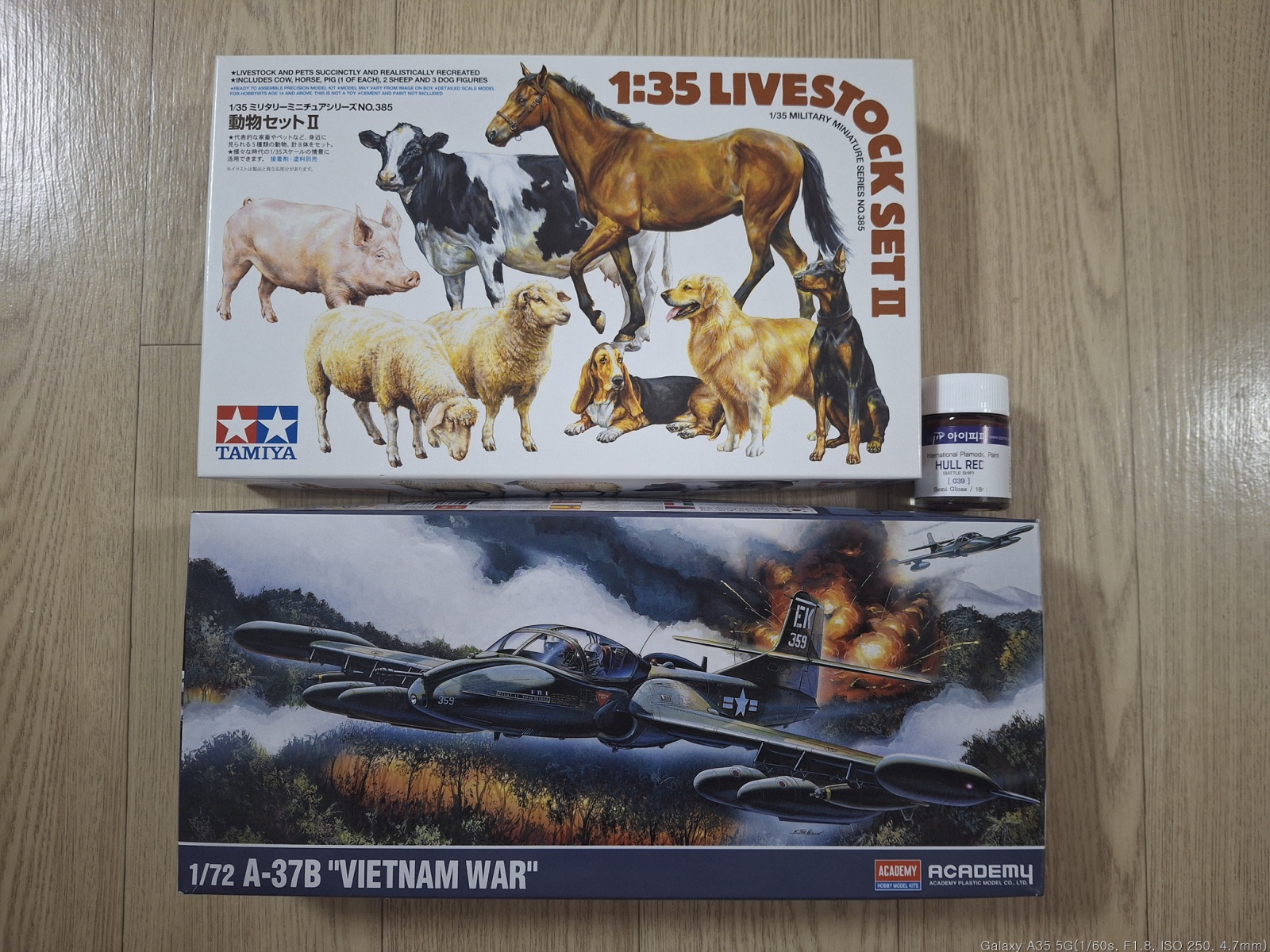 사온 키트들. 가축세트2는 디오라마 꾸밀때, 그리고 A-37B 베트남전 사양은 작은 녀석이 야무져(?)보이길래 언젠가 사야지 했었는데 마침 보이길래 집었습니다.