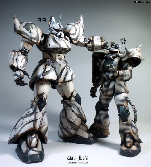 이 킷은 앞전의 겔구그와 마찬가지로 간단한(?) 한랭지의 디오라마를 만들어 보기 위해 완성한 녀석임으로, 또 동계위장을 하게 됬습니다. 허나 이왕하는 거 겔구그와는 쬐금은 다르게 실용기에 쓰이는 위장을 컨셉으로,도색을 해봤습니다만...티가 난건지..원..모르겠네요.