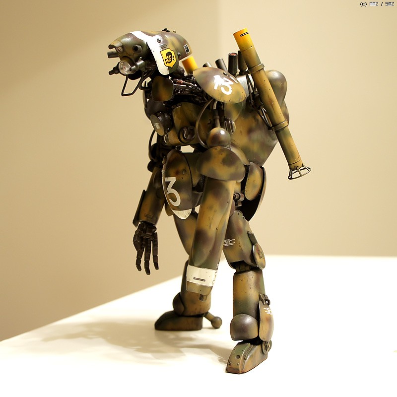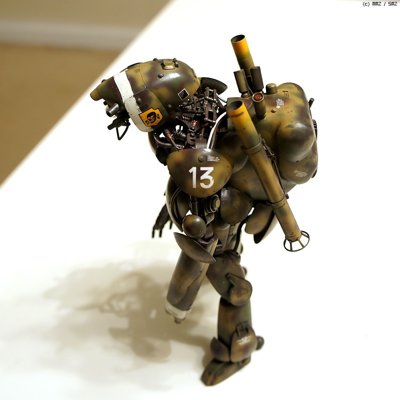 등짝의 엔진부도 상기 컬러들로 드라이브러싱해주고 팔에 있는 3쌍의 동력선(?)중 1쌍은 흰색으로 칠해주었습니다. 그 후에 1000번 사포로 위장 표면을 부분별로 살짝씩 긁어주어 자연스레 밑색들이 드러나게 했습니다.